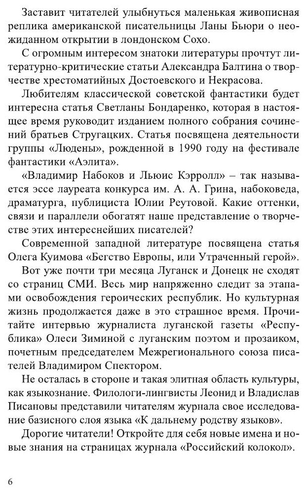 «Российский колокол» 6 Заставит читателей улыбнуться маленькая живописная реплика американской писательницы Ланы Бьюри о неожиданном открытии в лондонском Сохо. С огромным интересом знатоки литературы прочтут литературно-критические статьи Александра Балтина о творчестве хрестоматийных Достоевского и Некрасова. Любителям классической советской фантастики будет интересна статья Светланы Бондаренко, которая в настоящее время руководит изданием полного собрания сочинений братьев Стругацких. Статья посвящена деятельности группы «Людены», рожденной в 1990 году на фестивале