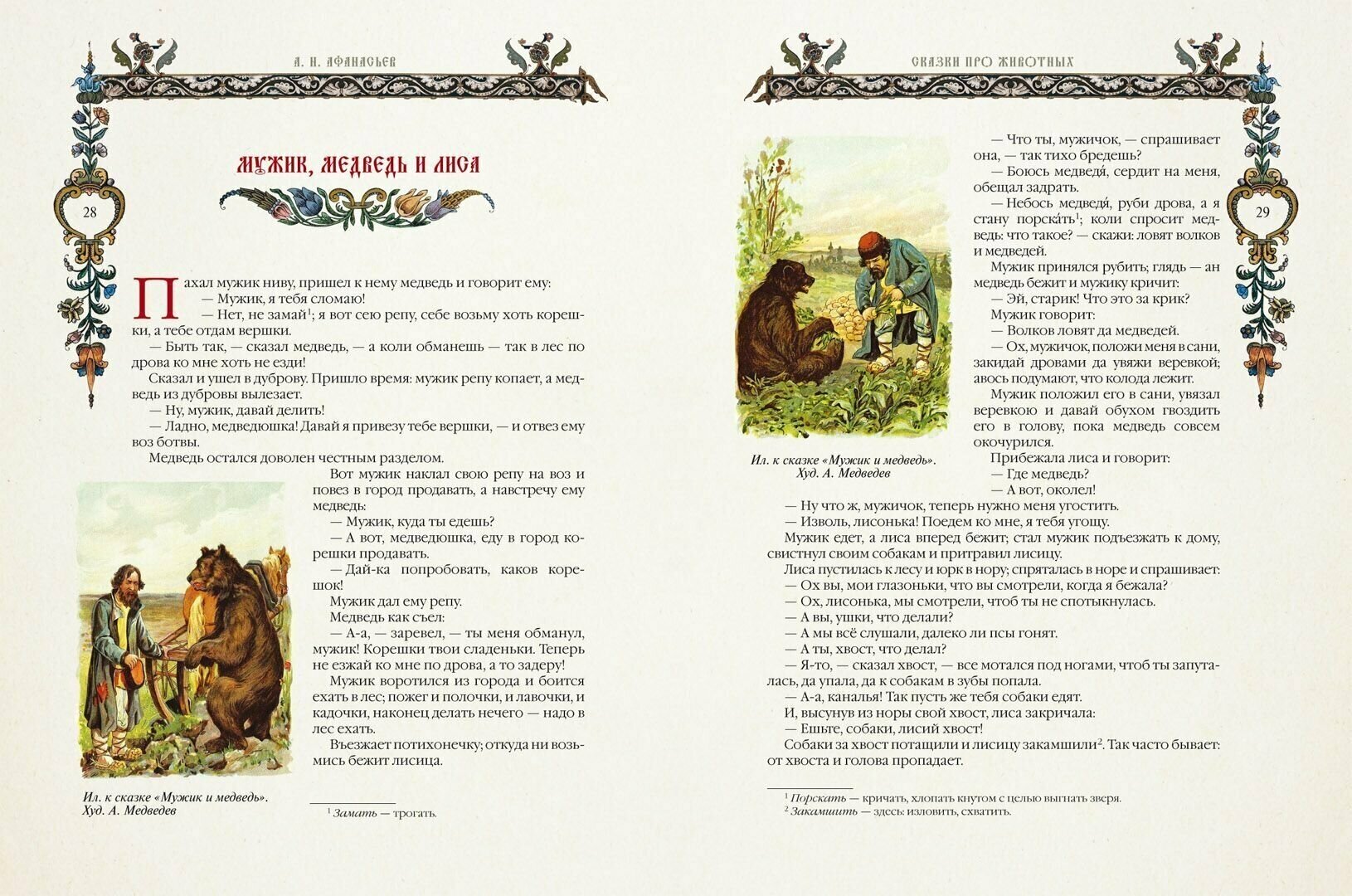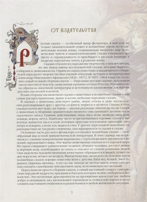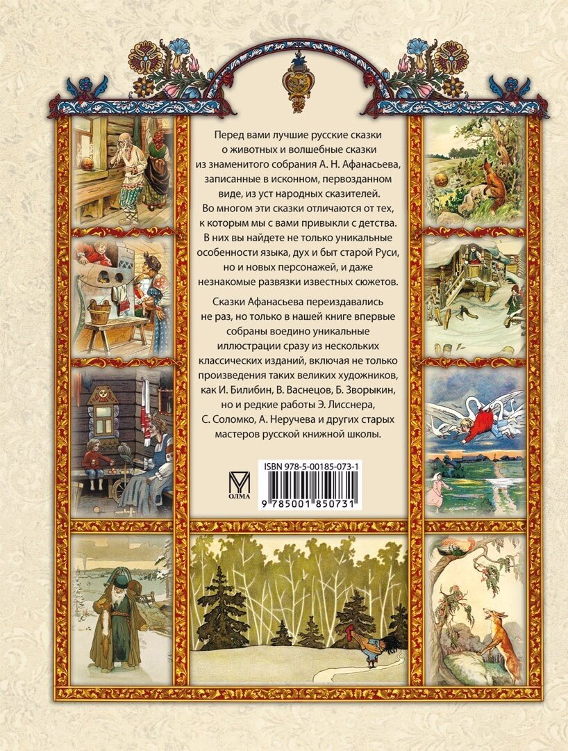 Перед вами лучшие русские сказки о животных и волшебные сказки из знаменитого собрания А. Н. Афанасьева, записанные в исконном, первозданном виде, из уст народных сказителей. Во многом эти сказки отличаются от тех, к которым мы с вами привыкли с детства. В них вы найдете не только уникальные особенности языка, дух и быт старой Руси, но и новых персонажей, и даже незнакомые развязки известных сюжетов. Сказки Афанасьева переиздавались не раз, но только в нашей книге впервые собраны воедино уникальные иллюстрации сразу из нескольких классических изданий, включая не только произведения таких великих художников, как И. Билибин, В. Васнецов, Б. Зворыкин, но и редкие работы Э. Лисснера, С. Соломко, А. Неручева и других старых мастеров русской книжной школы.