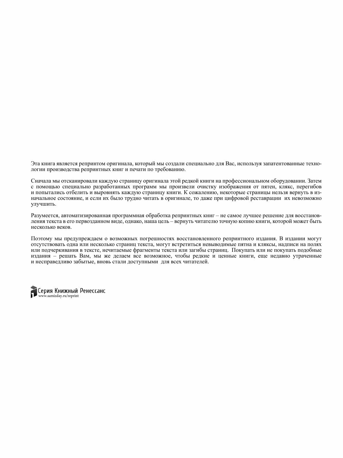 Эта книга — репринт оригинального издания (издательство "Москва: скл. Издательство у автора", 1916 год), созданный на основе электронной копии высокого разрешения, которую очистили и обработали вручную, сохранив структуру и орфографию оригинального издания. Редкие, забытые и малоизвестные книги, изданные с петровских времен до наших дней, вновь доступны в виде печатных книг.