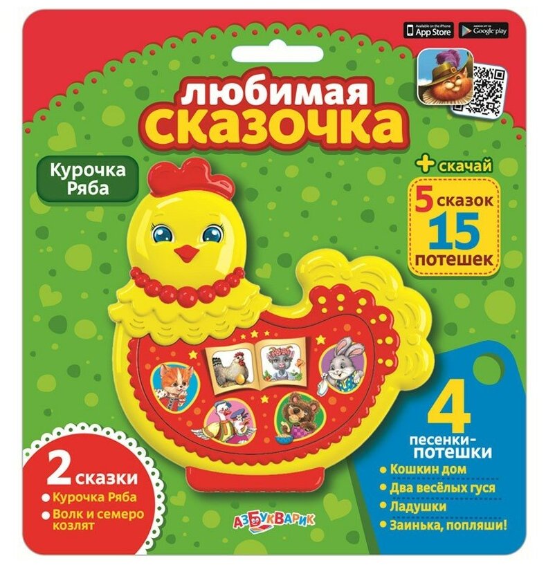 Музыкальная книжка «АЗБУКВАРИК Любимая сказочка. Курочка ряба» — интерактивная электронная игрушка для самых маленьких. При нажатии на кнопки она воспроизводит сказки «Курочка Ряба» и «Волк и семеро козлят», а также песенки-потешки «Кошкин дом», «Два веселых гуся», «Ладушки» и «Заинька, попляши!». Книжка выглядит ярко и привлекательно, она обязательно понравится ребенку. Аудиоконтент озвучен приятными голосами.