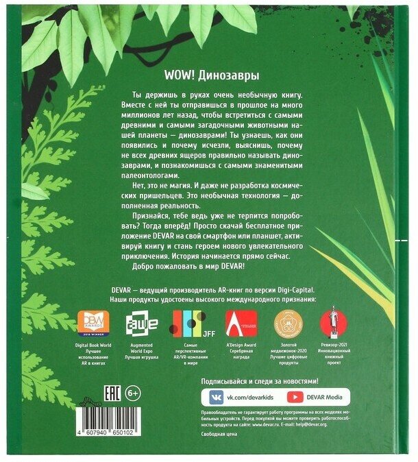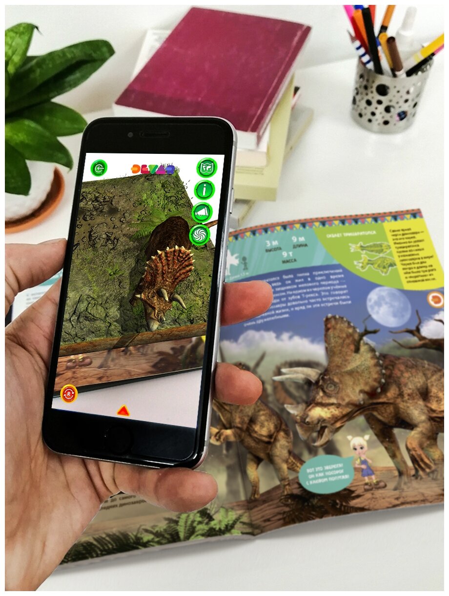 Энциклопедия в дополненной реальности "WOW! Динозавры" погрузит в доисторические времена и позволит ближе познакомиться с древнейшими представителями фауны. Наглядные анимации в 3D помогут изучить древних рептилий, их повадки и особенности. А настоящая квест-игра в дополненной подарит возможность стать участником сюжета и уникальной фантастической экспедиции в эру динозавров вместе с отважными путешественниками Дэнни и Энни. Отправляйся вместе с ними через магический портал в дневнике палеонтолога навстречу динозаврам, не выходя из комнаты. Ты сможешь сделать фото с динозавром в полный рост, покормить его, но будь осторожен: возможно, придётся убегать. Невероятные существа ждут!