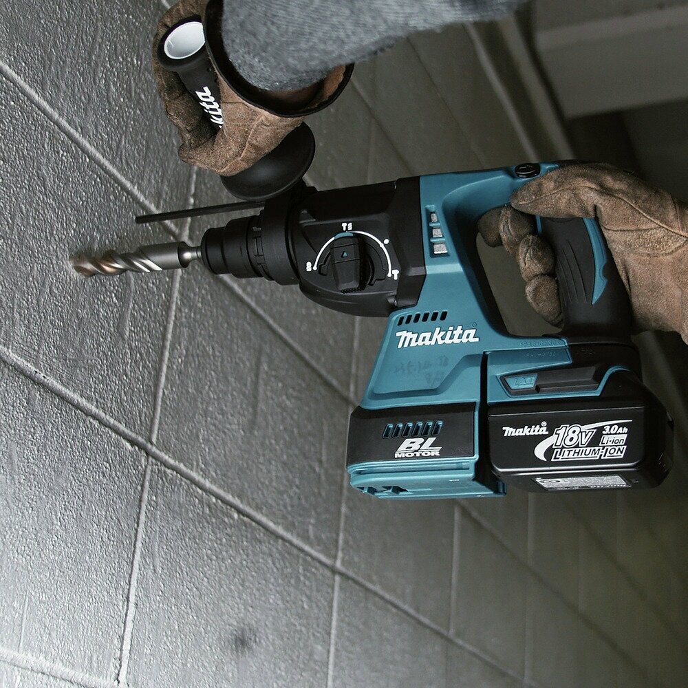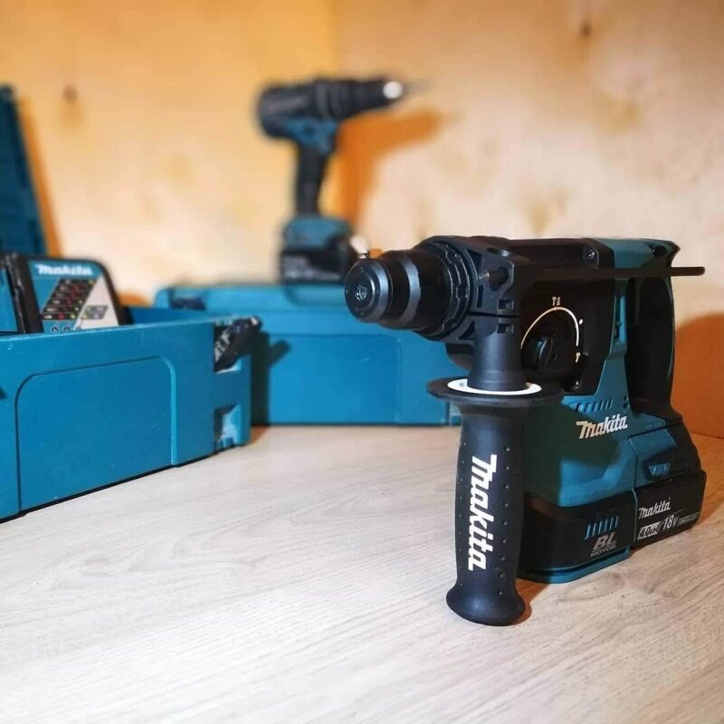Аккумулятор в комплект не входит! Аккумуляторный перфоратор Makita предназначен для сверления отверстий в древесине, металле, бетоне. На выбор имеются три рабочих режима: сверление, сверление с ударом, чистый удар, а также режим поворота долота. Скорость вращения шпинделя регулируется усилием нажатия на пусковую клавишу. Функция реверса упрощает выведение застрявшего в материале сверла.
