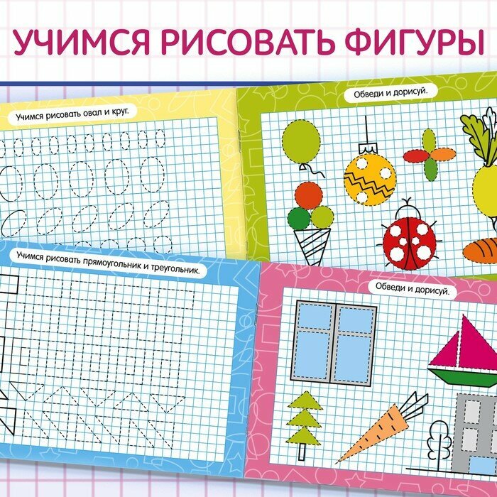Во время занятий малыш будет обводить рисунки по пунктирной линии, тем самым потренирует моторику, а также узнает, какие геометрические фигуры бывают.