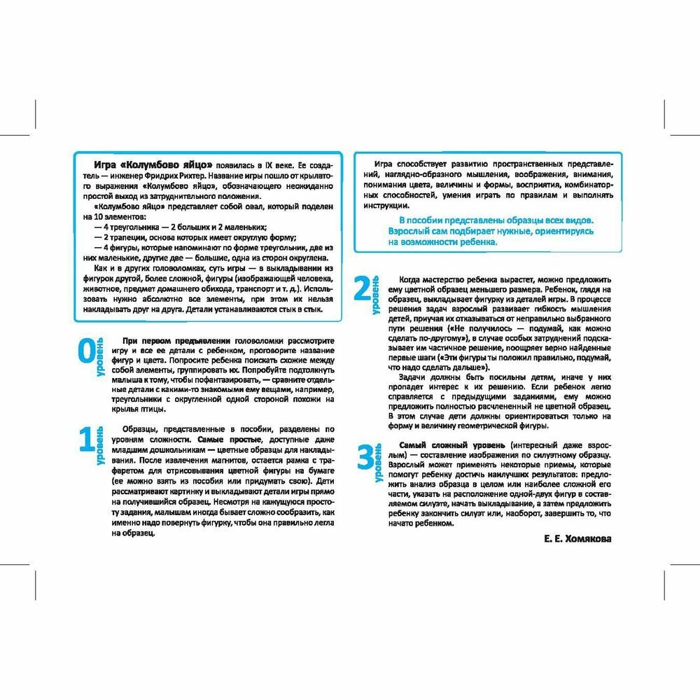 Геометрические конструкторы (головоломки) - эффективное средство умственного развития дошкольников. Они способствуют формированию логического мышления и познавательных способностей детей, помогают увидеть многообразие геометрических фигур. Суть игры «Колумбово яйцо» - в выкладывании из фигурок другой, более сложной, фигуры (изображающей человека, животное, предмет домашнего обихода, транспорт и т. д.). Игра способствует развитию пространственных представлений, наглядно-образного мышления, воображения, внимания, понимания цвета, величины и формы, восприятия, комбинаторных способностей, умения играть по правилам и выполнять инструкции.