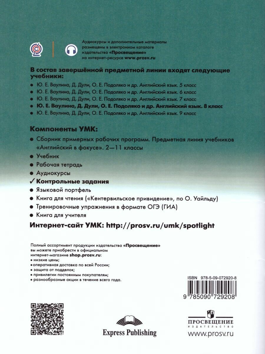 Книга Английский в фокусе (Spotlight) Контрольные задания. 8 класс (Юлия Евгеньевна Ваулина); Просвещение, 2019