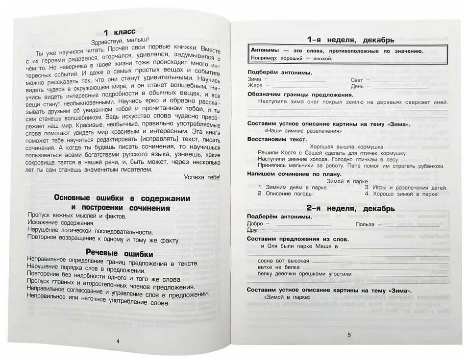 Уважаемые взрослые! Развитие не только устной, но и письменной правильной и красивой речи у ребёнка - задача важная, но очень непростая. Данное пособие поможет вам в решении этой задачи. Образная, яркая, логично построенная речь - основной показатель интеллектуального уровня ребёнка. В этом пособии нашли отражение разнообразные виды заданий, нацеленных на активизацию словарного запаса ребёнка. Здесь представлен богатый материал по исследованию значений слов и разнообразных оттенков этих значений (подбор синонимов, антонимов, объяснение фразеологизмов). В конце книги дан словарь всех синонимов, антонимов, фразеологизмов, а также некоторых терминов, приводимых в пособии. В этой книге собран материал, направленный на устранение наиболее часто встречающихся ошибок детей: - неправильное или неточное употребление слова, - нарушение порядка слов в предложении, - неверное определение границ предложения в тексте, - повторение одного и того же слова. Выполняя эти задания, малыши восстанавливают деформированные тексты, составляют планы рассказов, придумывают заглавия, редактируют (исправляют) тексты и предложения и т.д. По мере овладения этими навыками задания постепенно начинают выполнять роль вспомогательных упражнений на этапе подготовки детей к написанию сочинений. Чем больше ребёнок напишет сочинений, тем быстрее и лучше он будет их писать. Уважаемые учителя и родители! Вслушайтесь в эти слова и поверьте учителю-практику с многолетним стажем. Мои ученики писали великолепные сочинения, которые потом печатались во многих учебных изданиях. Но ни в коем случае нельзя исправлять грамматические ошибки в сочинении или заставлять выделять зелёной ручкой орфограммы. Тогда ученик будет выбирать слова, в написании которых он уверен или в которых как можно меньше орфограмм (вместо длинного слова замечательно он лучше напишет хорошо и т.д.). И ещё. Нельзя ставить "двойки" за не написанные в классе сочинения. Переход от устной речи к письменной у многих детей происходит очень тяжело. Но часто бывает, что именно эти дети раскрываются порой лучше, их сочинения короткие, но ёмкие, образные. В самом ужасном на ваш взгляд сочинении постарайтесь отыскать хотя бы крошечную изюминку, за которую можно поощрить малыша. Чаще хвалите детей, обязательно читайте в классе лучшие сочинения. В пособии на каждом занятии детям предлагается написать сочинение по готовому плану. В некоторых занятиях даны на выбор 1-2 сочинения. Таким образом, уже в первом классе ученик напишет более 10 сочинений. Книга, предлагаемая вашему вниманию, является уникальным пособием, в котором собраны и объединены в систему лучшие методические достижения в области обучения написанию сочинений. 5-е издание, стереотипное.