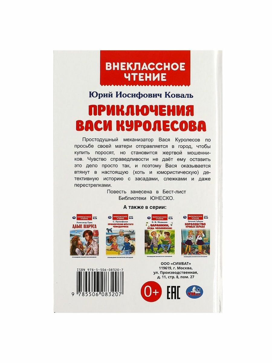 Книга «Ю. Коваль. Приключения Васи Куролесова» из серии «Внеклассное чтение» ТМ «УМка» - отличный вариант для самостоятельного чтения вне занятий в школе:- произведение печатается без сокращений- увлекательный сюжет- яркие крупные картинки- крупный шрифт- твёрдый переплёт- удобный формат- соответствует ФГОС- повесть занесена в Бест-лист Библиотеки ЮНЕСКОПростодушный механизатор Вася Куролесов по просьбе своей матери отправляется в город, чтобы купить поросят, но становится жертвой мошенников. Чувство справедливости не даёт ему оставить это дело просто так, и поэтому Вася оказывается втянут в настоящую (хоть и юмористическую) детективную историю с засадами, слежками и даже перестрелками. Наличие цветных иллюстраций сделает чтение этой захватывающей повести ещё более интересным. Благодаря компактному размеру книгу удобно брать с собой в поездки.Чтение книг из серии «Внеклассное чтение» ТМ «УМка» расширяет кругозор и развивает:- образное мышление- визуальное восприятие- внимание- память- речьОбъём: 128 стр. Формат: 125 х 195 мм (А5).Материал: офсетная бумага.Рекомендовано детям младшего школьного возраста.