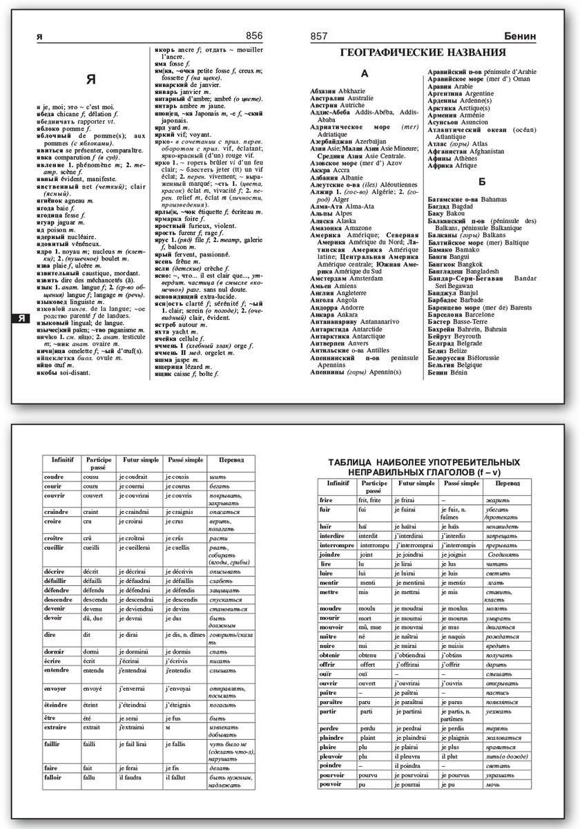 Словарь содержит более 29 000 слов современного французского литературного языка и более 26 000 - русского литературного языка с подробным описанием значений. Частотный метод, используемый при составлении словаря, позволил включить в него наиболее употребительные и значимые лексические единицы современного литературного языка и разговорной речи. Предназначен для широкого круга лиц, изучающих французский язык: учащихся старших классов, студентов, туристов, выезжающих во франкоязычные страны.