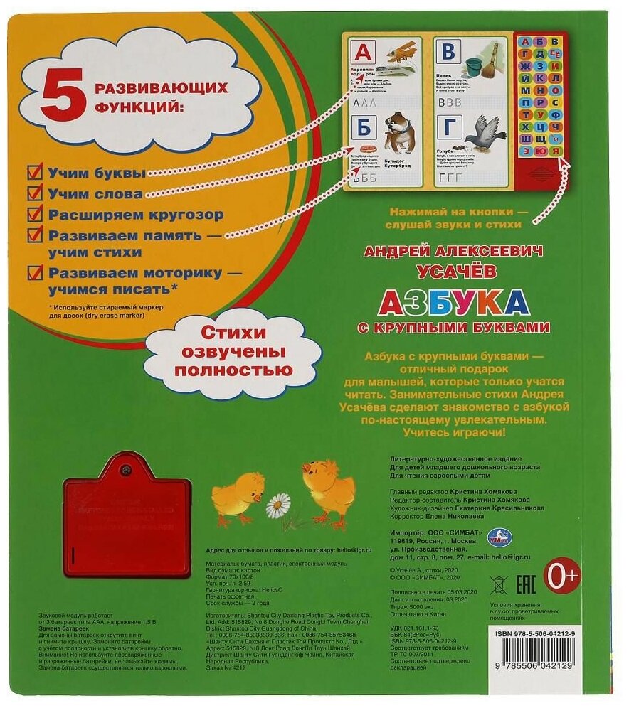 Книжка с музыкальным модулем содержит обучающий материал и 33 кнопки. - Красочное издание с яркими картинками познакомит малышей с буквами русского алфавита. - Звуковой модуль активируется при нажатии на кнопку. - Текст сделан крупным, чтобы дети постарше могли научиться читать его. - Книга сделана из плотного картона и качественно иллюстрирована. - Такую книгу будет очень интересно читать и разглядывать, а также развивать мелкую моторику и цветовое восприятие. - Книжка небольшого размера, ее очень удобно держать в руках. Издание имеет безопасный и удобный формат. - Чтение способствует тренировке памяти, усидчивости, слухового и зрительного восприятия, мелкой моторики рук. - Работает от 3-х батареек типа ААА (в комплекте).