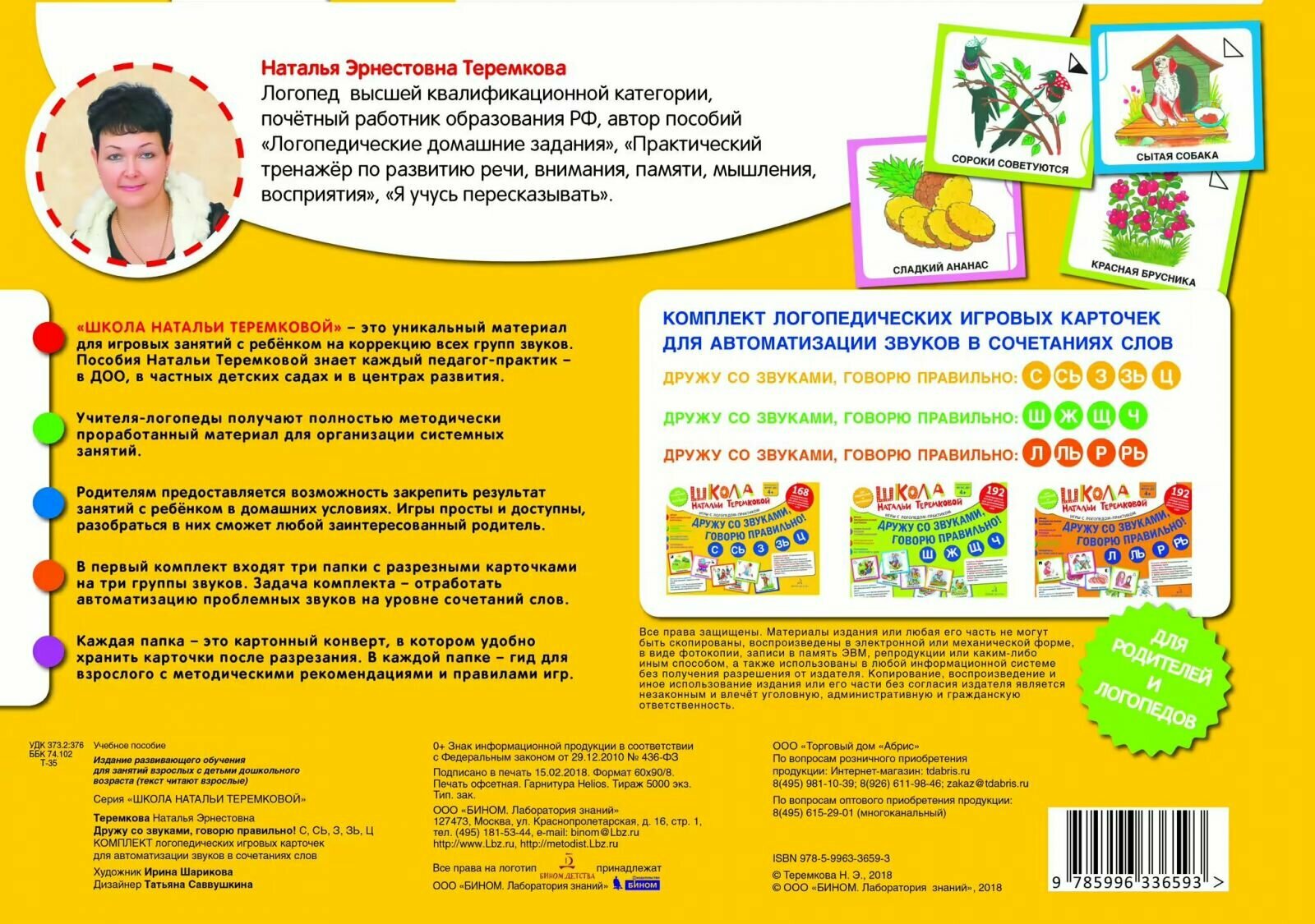 Как подружить ребенка со сложными звуками?Как научить его правильной речи, а в дальнейшем и грамотному письму?В этом поможет комплект разрезных карточек "Школа Натальи Теремковой" - уникальный материал для игровых занятий с ребенком на закрепление всех групп звуков. Вам не нужно думать, какие тетради и пособия подобрать, чтобы правильно организовать обучение малыша. Каждый альбом серии "Дружу со звуками, говорю правильно", который входит в "Школу" - лучшее решение для закрепления в короткий срок звуков, поставленных логопедом. Благодаря комплекту вы также активируете у ребенка слуховое, зрительное восприятие, память и связную речь.О чем альбомТрудно представить успешного человека, речь которого невнятна, который не выговаривает половину звуков. Такому человеку придется приложить намного больше усилий, чтобы добиться успеха в жизни. Поэтому так важно научиться говорить правильно с детства.Исправить даже самые сложные свистящие звуки С, Сь, З, Зь, Ц можно! Если работать над ними в игровой форме. Именно такие занятия Наталья Теремкова предлагает родителям и педагогам в новом альбоме.Каждый комплект - это папка, в которую удобно складывать и хранить 14 двусторонних листов с игровыми разрезными карточками. В каждой папке - гид для взрослого с методическими рекомендациями и правилами игр для автоматизации чистого произношения звуков С, Сь, З, Зь, Ц в сочетаниях слов. 168 уникальных картинок и словосочетаний с кодовыми символами на каждой разрезной карточке помогут привлечь внимание ребенка к изучаемому звуку, активируют память, звуковое, зрительное восприятие и способствуют самостоятельному произнесению фраз. Такие игровые задания легко побуждают самого ребёнка участвовать в процессе исправления звукопроизношения.Для родителейЧем раньше обратить внимание на искаженное произношение звуков у ребенка, тем легче исправить эти недостатки речи.Правильно подобранные логопедом-практиком предметные картинки позволяют закрепить произношение сначала в слогах, затем в словах и в сочетаниях слов, предложениях и связной речи. Звуки закрепляются во всех позициях - в начале, в середине и в конце слов.Обратите внимание! При выборе карточек выбирайте тот звук, который нуждается в автоматизации (закреплении). Обращайте внимания на рекомендации вашего логопеда. Не используйте слова и фразы, содержащие другие звуки, которые ребенок произносит дефектно!О серии:Вот уже 20 лет малыши в детских садах учатся правильно произносить звуки вместе с пособиями автора-логопеда Натальи Теремковой. Комплект серии "Школа Натальи Теремковой" мы разработали специально для закрепления у ребенка уже поставленных звуков вместе с логопедом или дома, с родителями. Учителя-логопеды получают полностью методически проработанный материал для организации системных занятий.Родителям предоставляется возможность закрепить результат занятий с ребёнком в домашних условиях. Игры просты и доступны, разобраться в них сможет любой заинтересованный родитель.В серии представлены 3 альбома на три группы звуков:"Дружу со звуками, говорю правильно! Ш, Ж, Щ, Ч""Дружу со звуками, говорю правильно! С, Сь, З, Зь, Ц""Дружу со звуками, говорю правильно! Л, Ль, Р, Рь"Благодаря всему комплекту вы проработаете все звуки, все типы и виды речевых проблем.Об авторе:Наталья Теремкова - учитель-л