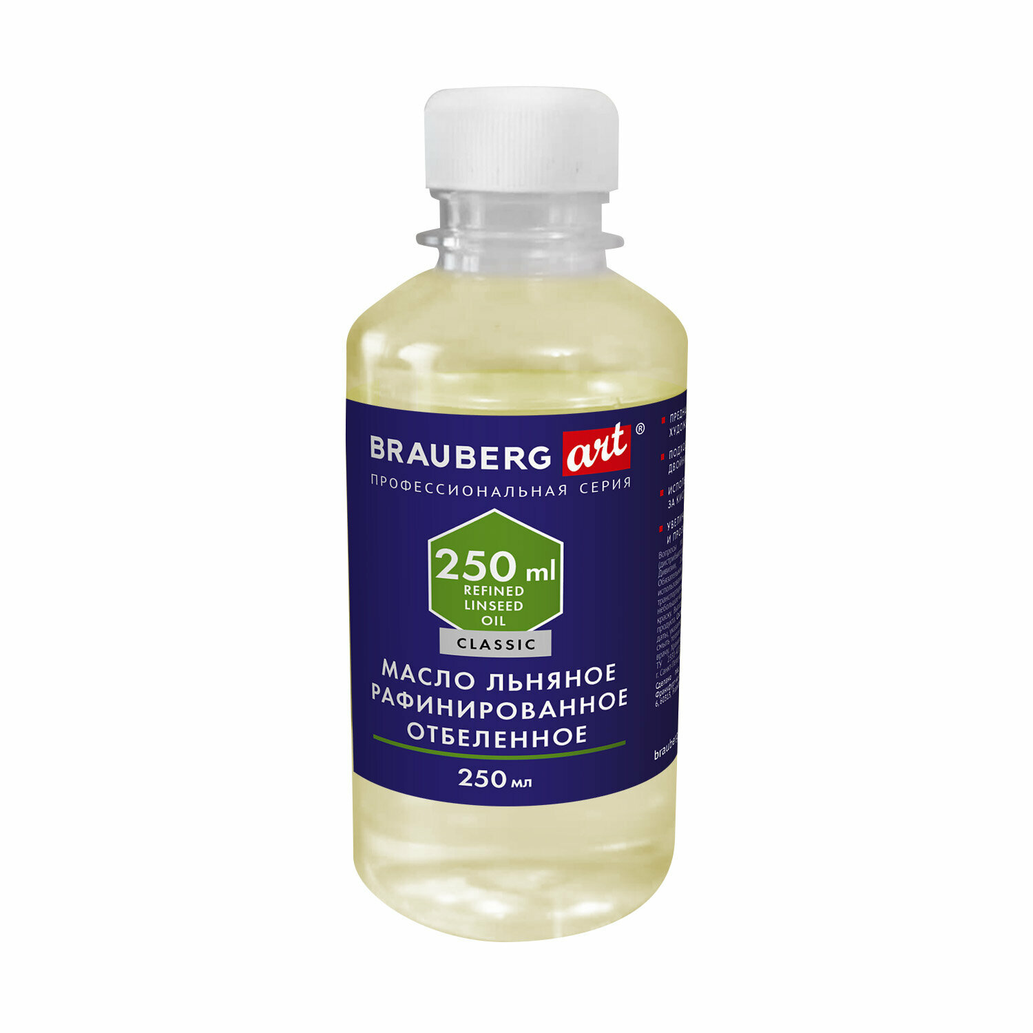 Льняное масло BRAUBERG ART CLASSIC рафинированное отбеленное идеально подходит для живописи масляными красками, а также для ухода за кистями. Масло для художественных работ из семян льна предназначено для разведения масляных красок. Подходит для приготовления разбавителей "двойник" и "тройник". Используется для бережного ухода за кистями. Увеличивает время высыхания красок, их прозрачность. Повышает разносимость и сцепление красок с поверхностями и между красочными слоями.