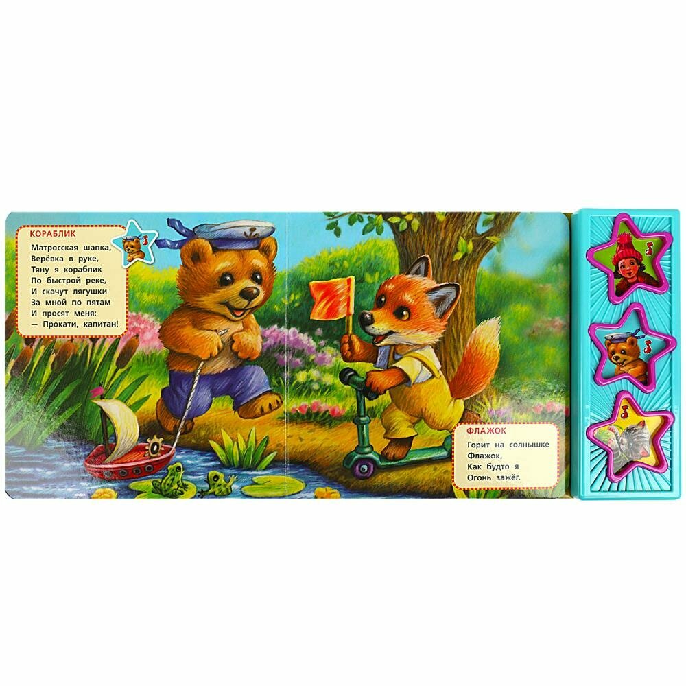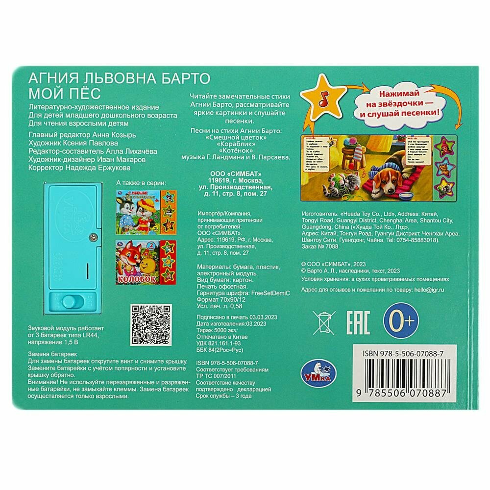 Музыкальная книга "А. Барто. Мой пёс" ТМ "УМка" станет прекрасным подарком для малыша:- 3 звуковые книги-звёздочки- 3 песенки на стихи: "Смешной цветок", "Кораблик", "Котёнок"- тексты стихов- красочные иллюстрации- отдельная кнопка Вкл./Выкл. на оборотеРебёнок с удовольствием будет листать плотные страницы с яркими картинками, нажимать на кнопку с рисунком, знакомиться с творчеством Агнии Барто и слушать три песенки на стихи автора. Одно нажатие на кнопку – песенка включится, второе нажатие – выключится. Книжка сделана из плотного картона, поэтому родители могут не опасаться за её сохранность. Благодаря компактному формату книгу удобно брать с собой в дорогу.Чтение музыкальной книги ТМ "УМка" и игра с ней развивают:- слуховое восприятие- мелкую моторику- фантазию- образное мышление- памятьОбъём: 6 стр. Формат: 206 х 150 мм.Материал: картон + пластмасса.Работает от 3-х батареек типа LR44 (в комплекте).Рекомендовано детям младшего дошкольного возраста.