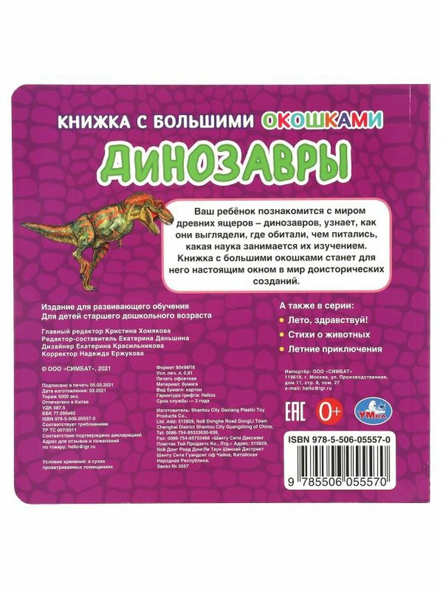 Сервис сравнения цен СкидкаГИД предлагает сравнить цены на товар «Книга: Книга ДИНОЗАВРЫ (книжка с большими окошками) 190х190мм 10стр Умка в кор.38шт (Даньшина Е.), 2021»