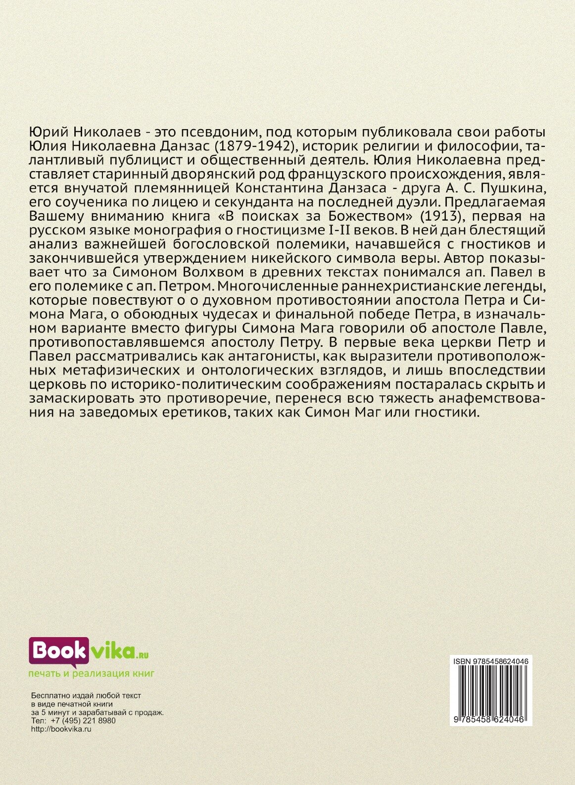 Юрий Николаев - это псевдоним, под которым публиковала свои работы Юлия Николаевна Данзас (1879-1942), историк религии и философии, талантливый публицист и общественный деятель. Юлия Николаевна представляет старинный дворянский род французского происхождения, является внучатой племянницей Константина Данзаса - друга А. С. Пушкина, его соученика по лицею и секунданта на последней дуэли. Предлагаемая Вашему вниманию книга «В поисках за Божеством» (1913), первая на русском языке монография о гностицизме I-II веков. В ней дан блестящий анализ важнейшей богословской полемики, начавшейся с гностиков и закончившейся утверждением никейского символа веры. Автор показывает что за Симоном Волхвом в древних текстах понимался ап. Павел в его полемике с ап. Петром. Многочисленные раннехристианские легенды, которые повествуют о о духовном противостоянии апостола Петра и Симона Мага, о обоюдных чудесах и финальной победе Петра, в изначальном варианте вместо фигуры Симона Мага говорили об апостоле Павле, противопоставлявшемся апостолу Петру. В первые века церкви Петр и Павел рассматривались как антагонисты, как выразители противоположных метафизических и онтологических взглядов, и лишь впоследствии церковь по историко-политическим соображениям постаралась скрыть и замаскировать это противоречие, перенеся всю тяжесть анафемствования на заведомых еретиков, таких как Симон Маг или гностики. Воспроизведено в оригинальной авторской орфографии издания 1913 года (издательство "С.-Петербург: Типография Т-ва А. С. Суворина - «Новое Время»").