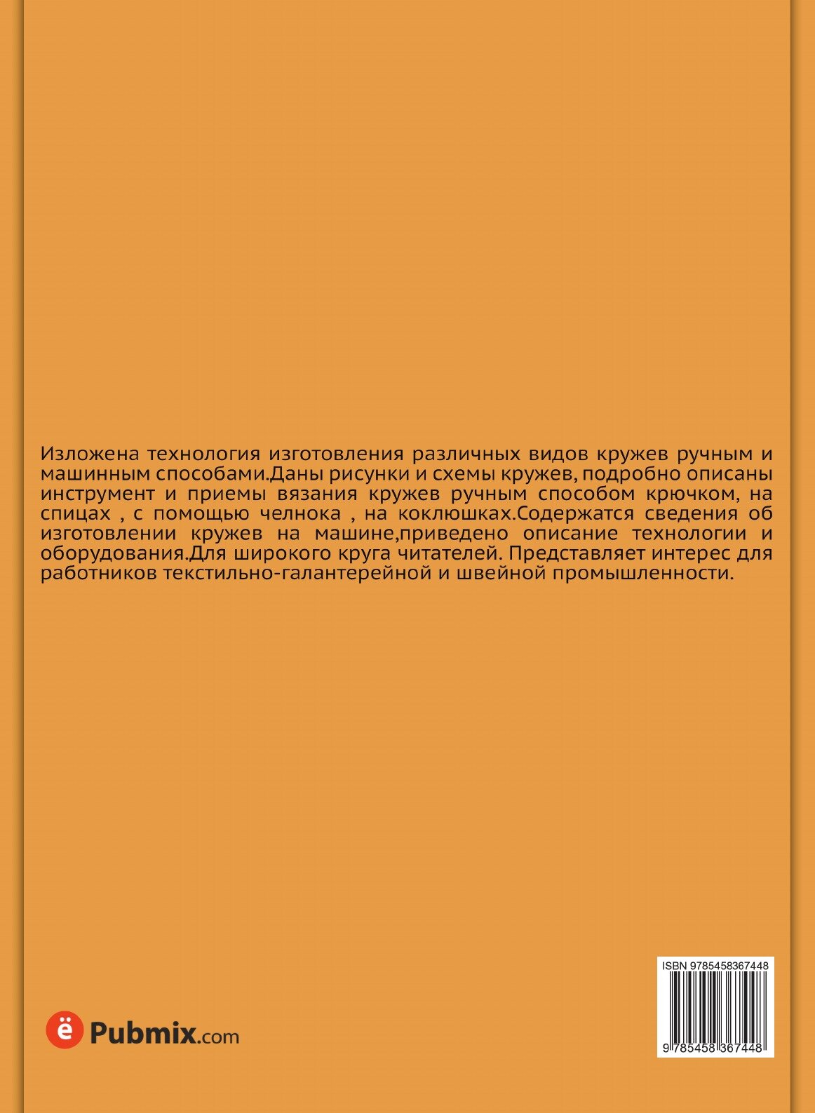 Изложена технология изготовления различных видов кружев ручным и машинным способами.Даны рисунки и схемы кружев, подробно описаны инструмент и приемы вязания кружев ручным способом крючком, на спицах , с помощью челнока , на коклюшках.Содержатся сведения об изготовлении кружев на машине,приведено описание технологии и оборудования.Для широкого круга читателей. Представляет интерес для работников текстильно-галантерейной и швейной промышленности.