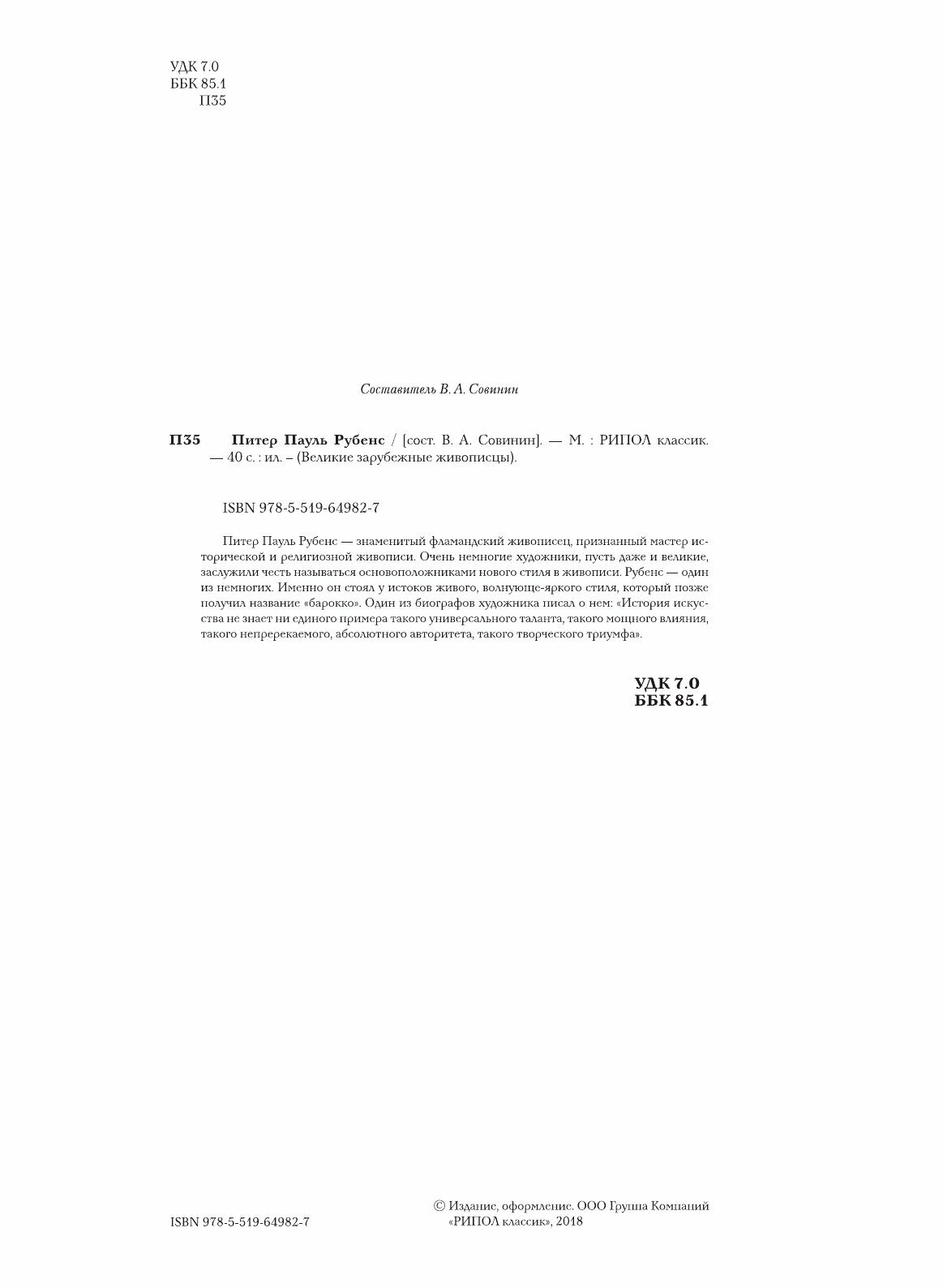 Питер Пауль Рубенс - знаменитый фламандский живописец, признанный мастер исторической и религиозной живописи. Очень немногие художники, пусть даже и великие, заслужили честь называться основоположниками нового стиля в живописи. Рубенс - один из немногих. Именно он стоял у истоков живого, волнующе-яркого стиля, который позже получил название "барокко". Один из биографов художника писал о нем: "История искусства не знает ни единого примера такого универсального таланта, такого мощного влияния, такого непререкаемого, абсолютного авторитета, такого творческого триумфа".Составитель В.А. Совинин.