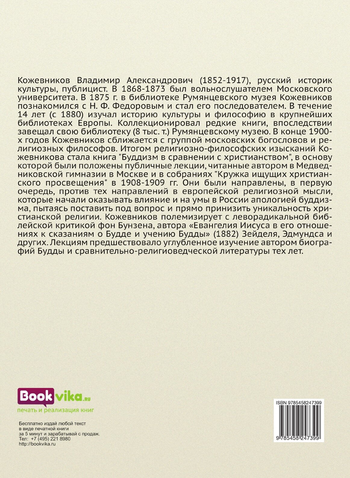 Кожевников Владимир Александрович (1852 1917), русский историк культуры, публицист. В 1868 1873 был вольнослушателем Московского университета. В 1875 г. в библиотеке Румянцевского музея Кожевников познакомился с Н. Ф. Федоровым и стал его последователем. В течение 14 лет (с 1880) изучал историю культуры и философию в крупнейших библиотеках Европы. Коллекционировал редкие книги, впоследствии завещал свою библиотеку (8 тыс. т.) Румянцевскому музею. В конце 1900-х годов Кожевников сближается с группой московских богословов и религиозных философов. Итогом религиозно-философских изысканий Кожевникова стала книга "Буддизм в сравнении с христианством", в основу которой были положены публичные лекции, читанные автором в Медведниковской гимназии в Москве и в собраниях "Кружка ищущих христианского просвещения" в 1908-1909 гг. Они были направлены, в первую очередь, против тех направлений в европейской религиозной мысли, которые начали оказывать влияние и на умы в России апологией буддизма, пытаясь поставить под вопрос и прямо принизить уникальность христианской религии. Кожевников полемизирует с леворадикальной библейской критикой фон Бунзена, автора «Евангелия Иисуса в его отношениях к сказаниям о Будде и учению Будды» (1882) Зейделя, Эдмундса и других. Лекциям предшествовало углубленное изучение автором биографий Будды и сравнительно-религиоведческой литературы тех лет. Воспроизведено в оригинальной авторской орфографии издания 1916 года (издательство "Типография М.Меркушева").