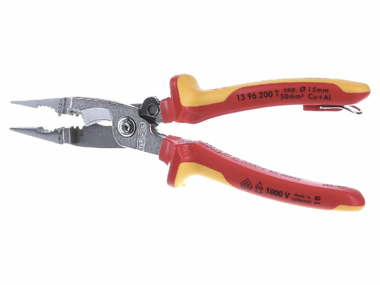 6 функций в одних клещах Mногофункциональные клещи для электромонтажных работ; для захвата плоского и круглого материала, гибки, удаления заусенцев, резки кабеля, удаления изоляции и опрессовки контактных гильз гладкие захватные губки для захвата отдельных жил без их повреждения; профилированные захватные губки и выемка для захвата плоского и круглого материала характерная наружная кромка на губке для обработки штепсельных розеток для скрытой проводки и удаления заусенцев на отверстиях для ввода кабеля отверстия для удаления изоляции с проводов 0,75 – 1,5 мм² и 2,5 мм² опрессовочное гнездо для контактных гильз 0,5 – 2,5 мм² ножницы с прецизионными лезвиями (индуктивной закалки) для резки медного и алюминиевого кабеля до 5 x 2,5 мм² / Ø 15 мм благодаря рациональному механизму удержания можно захватывать детали, не открывая клещи. Режущие кромки остаются сомкнутыми и защищенными. узкая конструкция облегчает доступ к детали винтовой шарнир: точный ход без зазоров Специальная инструментальная сталь особого качества, кованая, многократно закалённая в маслев моделях с разжимающей пружиной закрытие защёлки приводит к смыканию лезвий, но не блокирует другие функцииблагодаря рациональному механизму удержания можно захватывать детали, не открывая клещи. Режущие кромки остаются сомкнутыми и защищеннымиИнструмент с надёжным изолированным креплением для страховки инструмента от падения с высоты