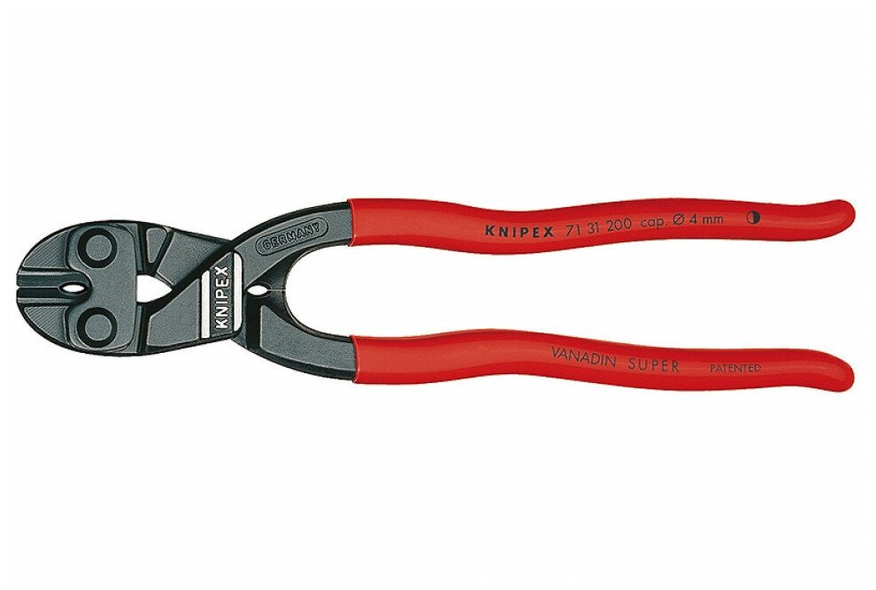 71 31 200 KNIPEX CoBolt® с прецизионными режущими кромками для резания мягкой и твердой проволоки, а также рояльной струны. режет болты, гвозди, заклепки и т.д. до Ø 5,2 мм. особо высокая режущая способность при меньшей затрате усилий благодаря высокоэффективной конструкции шарнира. . режущие кромки дополнительно закалены токами высокой частоты до твердости примерно 64 HRC. Специальная площадка под шарниром для захвата и протяжки проволоки диаметром свыше Ø 1,0 мм. - Параметры резания / мягкая проволока (диаметр): Ø 6mm - Параметры резания /проволока средней твёрдости (диаметр): Ø 5,2mm - Параметры резания / твёрдая проволока (диаметр): Ø 4,0mm - Параметры резания / рояльная струна (диаметр): Ø 3,6mm