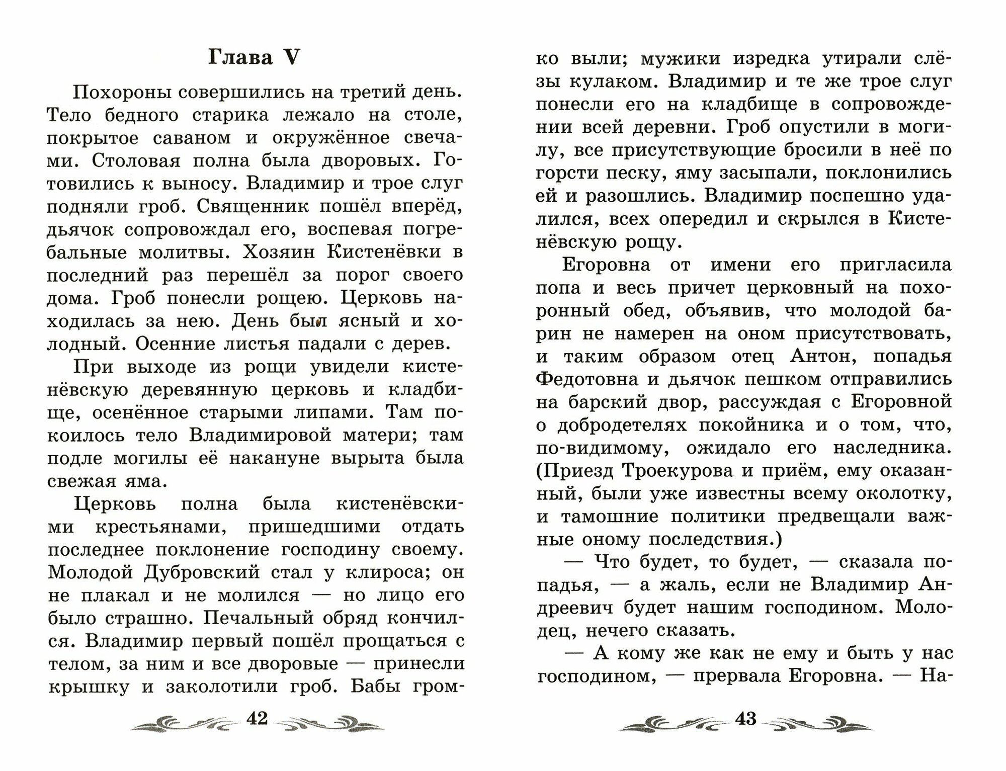 "Дубровский" (1833) был задуман как разбойничий роман на русском языке. Сюжет Пушкину подсказал рассказ приятеля об увиденном им в остроге "небогатом дворянине, по фамилии Островский, который был вытеснен из именья и, оставшись с одними крестьянами, стал грабить". Невозможная любовь детей врагов, "повесть печальная", дополнила канву. У деревни Кистенёвки, родового имения Дубровских, тоже есть оригинал: деревня Кистенёво, отцовский дар в честь будущей женитьбы поэта, да и Егоровна списана с крепостной Пушкиных, няни Арины Родионовны. Пушкин не закончил "Дубровского", возможно, ожидая цензурных затруднений, возможно, решив сосредоточиться на документальной прозе - "Истории Пугачёва". Повесть была напечатана через четыре года после его смерти.