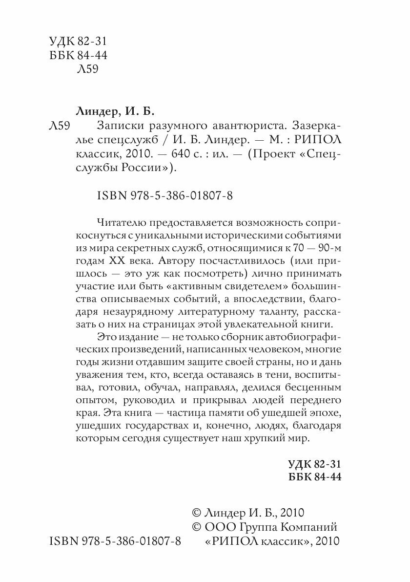 Книга Записки Разумного Авантюриста Зазеркалье Спецслужб (Линдер Иосиф Борисович); Книга по Требованию, 2010