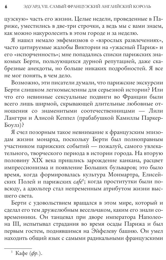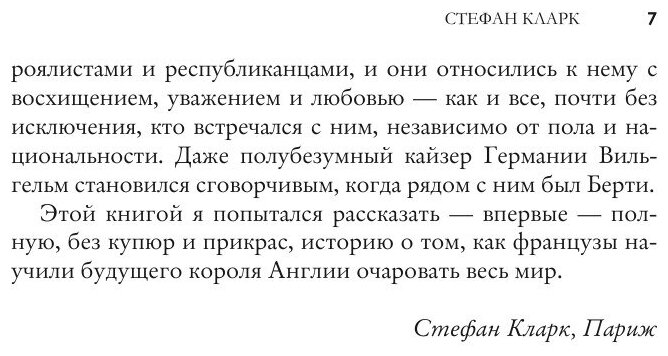 Стефан Кларк - современный британский журналист, однажды приехавший в Париж и волею судеб задержавшийся в нём на годы. Автор целого ряда публицистических и художественных история о Франции и её жителях. Вы держите в руках увлекательную книгу, в которой Стефан Кларк без купюр и прикрас рассказывает читателю о занимательной судьбе и приключениях самого французского английского короля - Эдуарда VII, большую часть жизни находившегося в тени королевы Виктории, однако вошедшего в историю как один из самых почитаемых британских монархов. "Король миротворец" и талантливый дипломат, страстно влюблённый во Францию, был известным охотником до танцовщиц и куртизанок… Эта книга перенесёт вас в неповторимую атмосферу XIX века и оставит неизгладимый след в душе каждого читателя.