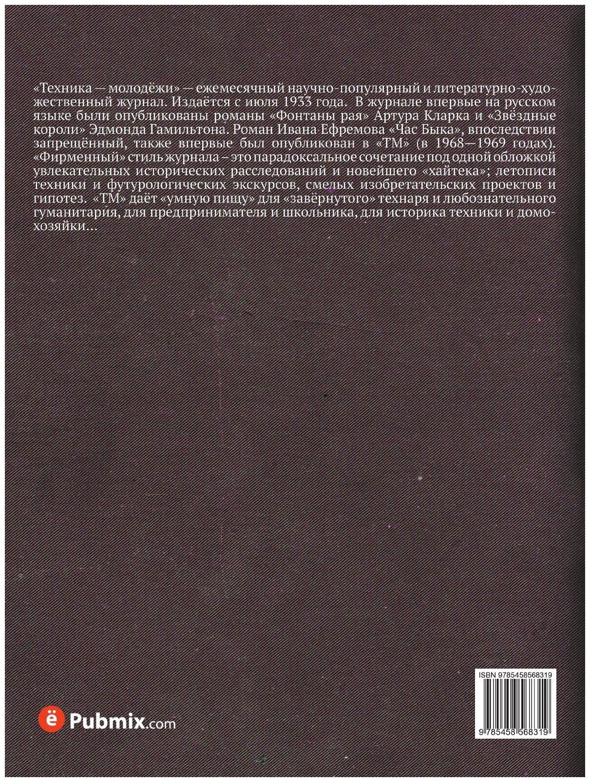 «Техника — молодёжи» — ежемесячный научно-популярный и литературно-художественный журнал. Издаётся с июля 1933 года. В журнале впервые на русском языке были опубликованы романы «Фонтаны рая» Артура Кларка и «Звёздные короли» Эдмонда Гамильтона. Роман Ивана Ефремова «Час Быка», впоследствии запрещённый, также впервые был опубликован в «ТМ» (в 1968—1969 годах).«Фирменный» стиль журнала – это парадоксальное сочетание под одной обложкой увлекательных исторических расследований и новейшего «хайтека»; летописи техники и футурологических экскурсов, смелых изобретательских проектов и гипотез. «ТМ» даёт «умную пищу» для «завёрнутого» технаря и любознательного гуманитария, для предпринимателя и школьника, для историка техники и домохозяйки…