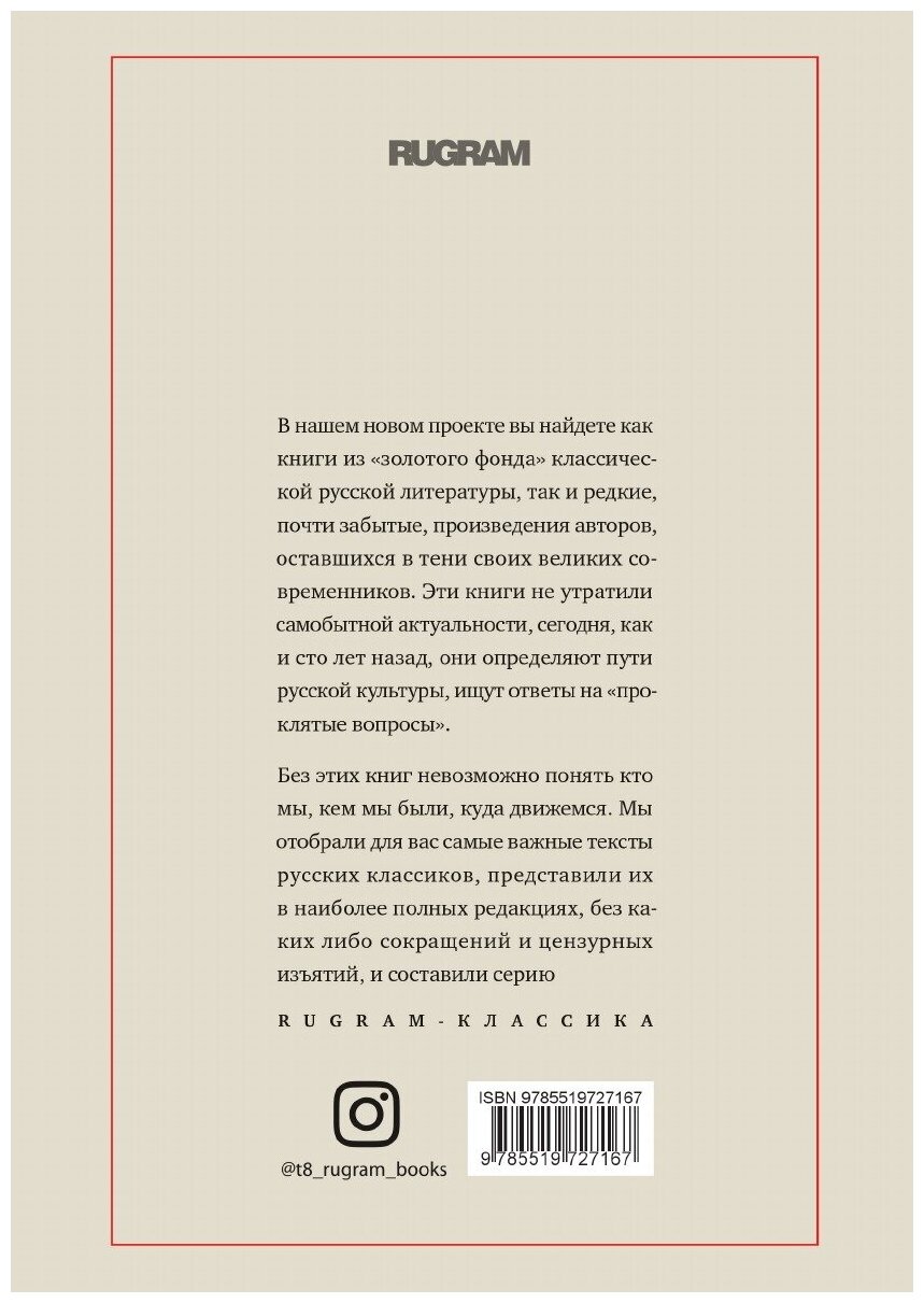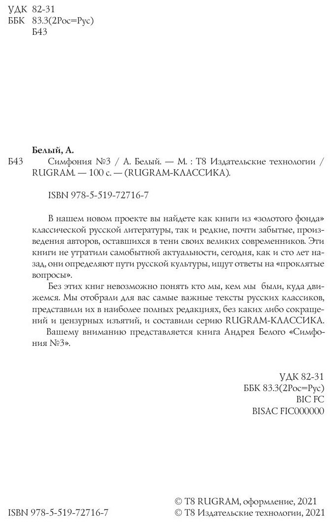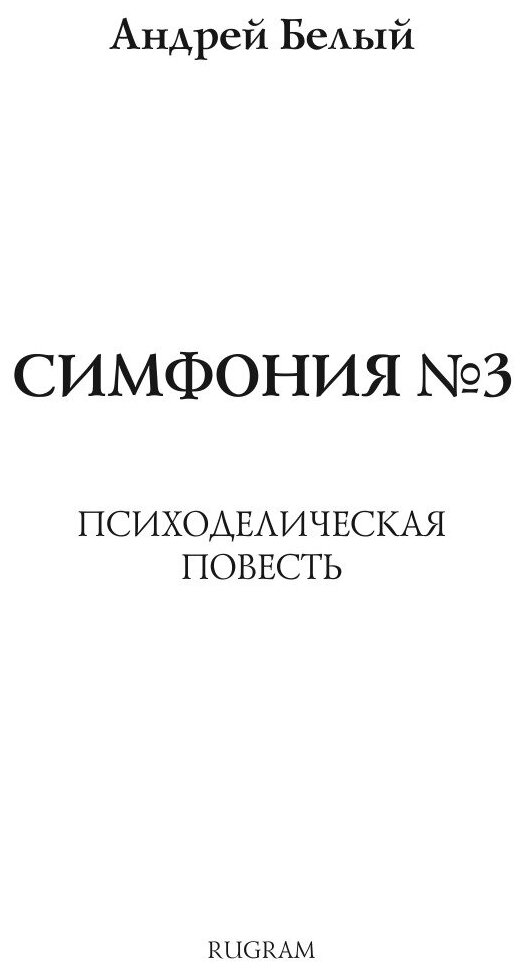 В нашем новом проекте вы найдете как книги из «золотого фонда» классической русской литературы, так и редкие, почти забытые, произведения авторов, оставшихся в тени своих великих современников. Эти книги не утратили самобытной актуальности, сегодня, как и сто лет назад, они определяют пути русской культуры, ищут ответы на «проклятые вопросы». Без этих книг невозможно понять кто мы, кем мы были, куда движемся. Мы отобрали для вас самые важные тексты русских классиков, представили их в наиболее полных редакциях, без каких либо сокращений и цензурных изъятий, и составили серию RUGRAM—КЛАССИКА. Вашему вниманию представляется книга Андрея Белого «Симфония №3».