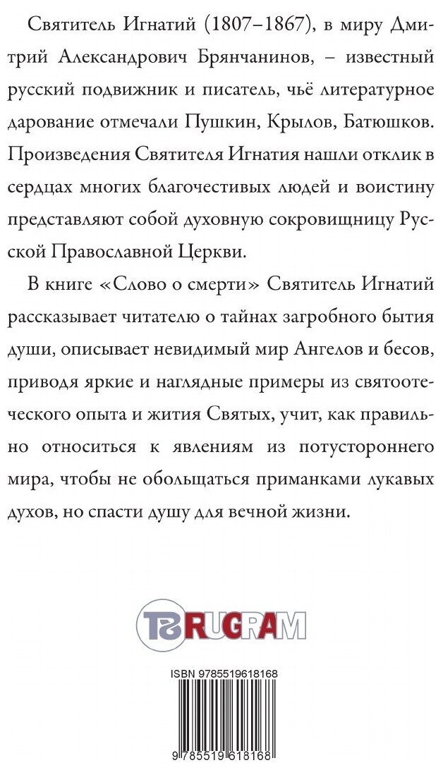 В книге "Слово о смерти"! святитель Игнатий рассказывает читателю о тайнах загробного бытия души, описывает невидимый мир Ангелов и бесов, приводя яркие и наглядные примеры из святоотеческого опыта и жития Святых, учит, как правильно относиться к явлениям из потустороннего мира, чтобы не обольщаться приманками лукавых духов, но спасти душу для вечной жизни.