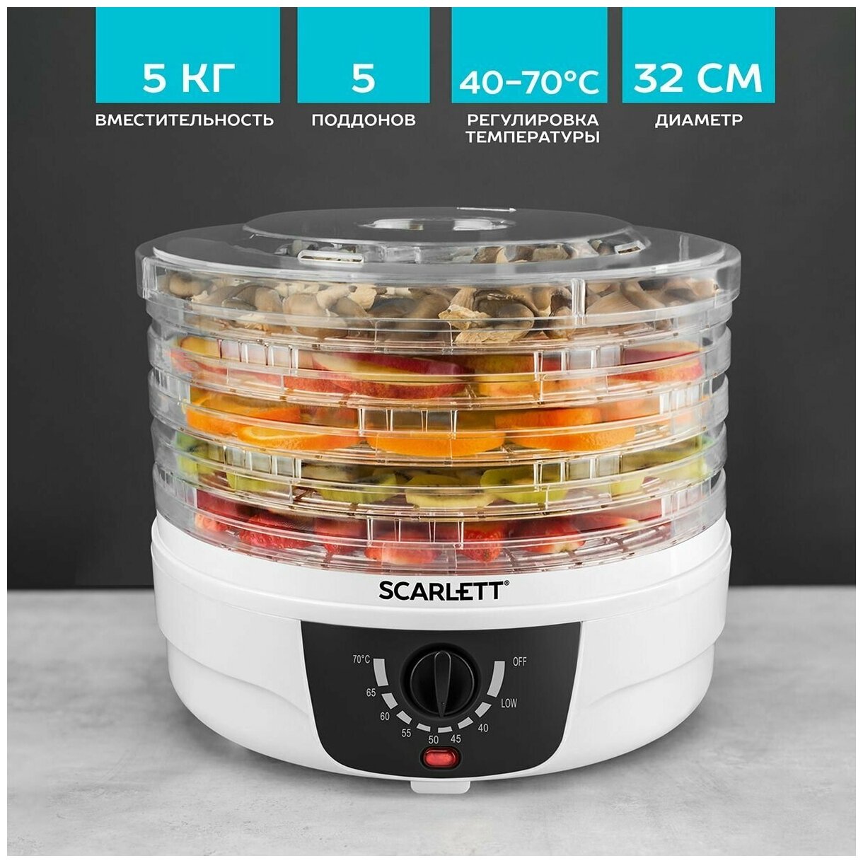 СушкаSCARLETT предназначена для сушки овощей, фруктов, грибов, трав и ягод в домашних условиях. Кроме того, может использоватьcя для приготовления пастилы и вяленого мяса. Предусмотрено 5 поддонов с регулируемой высотой для сушки продуктов. Максимальная загрузка каждого поддона до 1 кг. Одинаковая температура на всех уровнях обеспечивается за счет встроенному вентилятору.