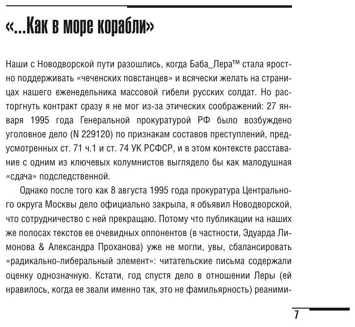 В книге собраны резонансные «нововзглядовские» колонки Новодворской и рассказано о разборках с прокуратурой и столичным КГБ, которое возглавлял в ту пору видный демократ Евгений Савостьянов.