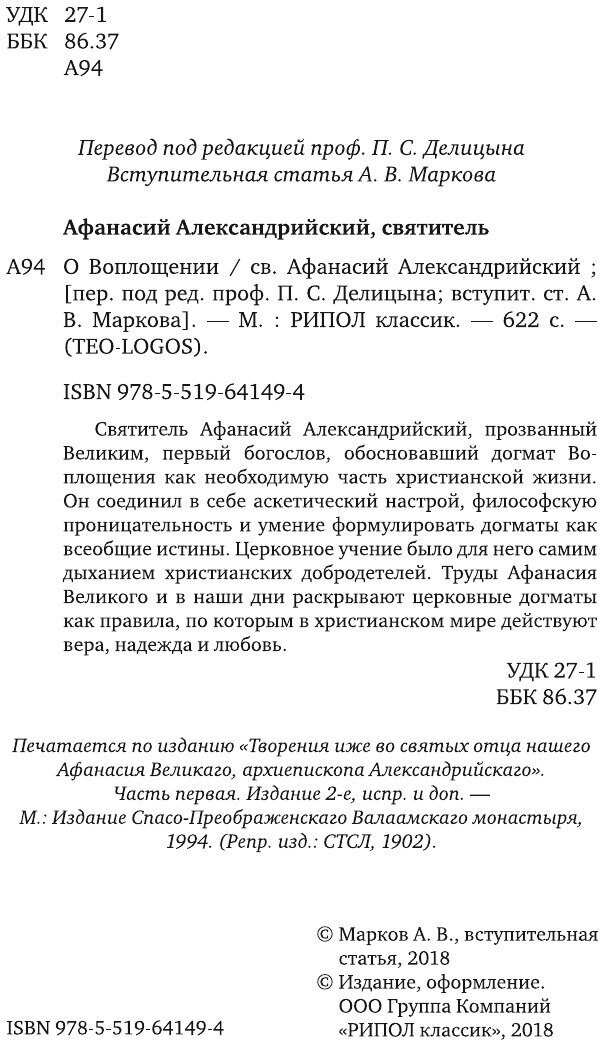 Книга: Книга О Воплощении (Александрийский Афанасий), 2018