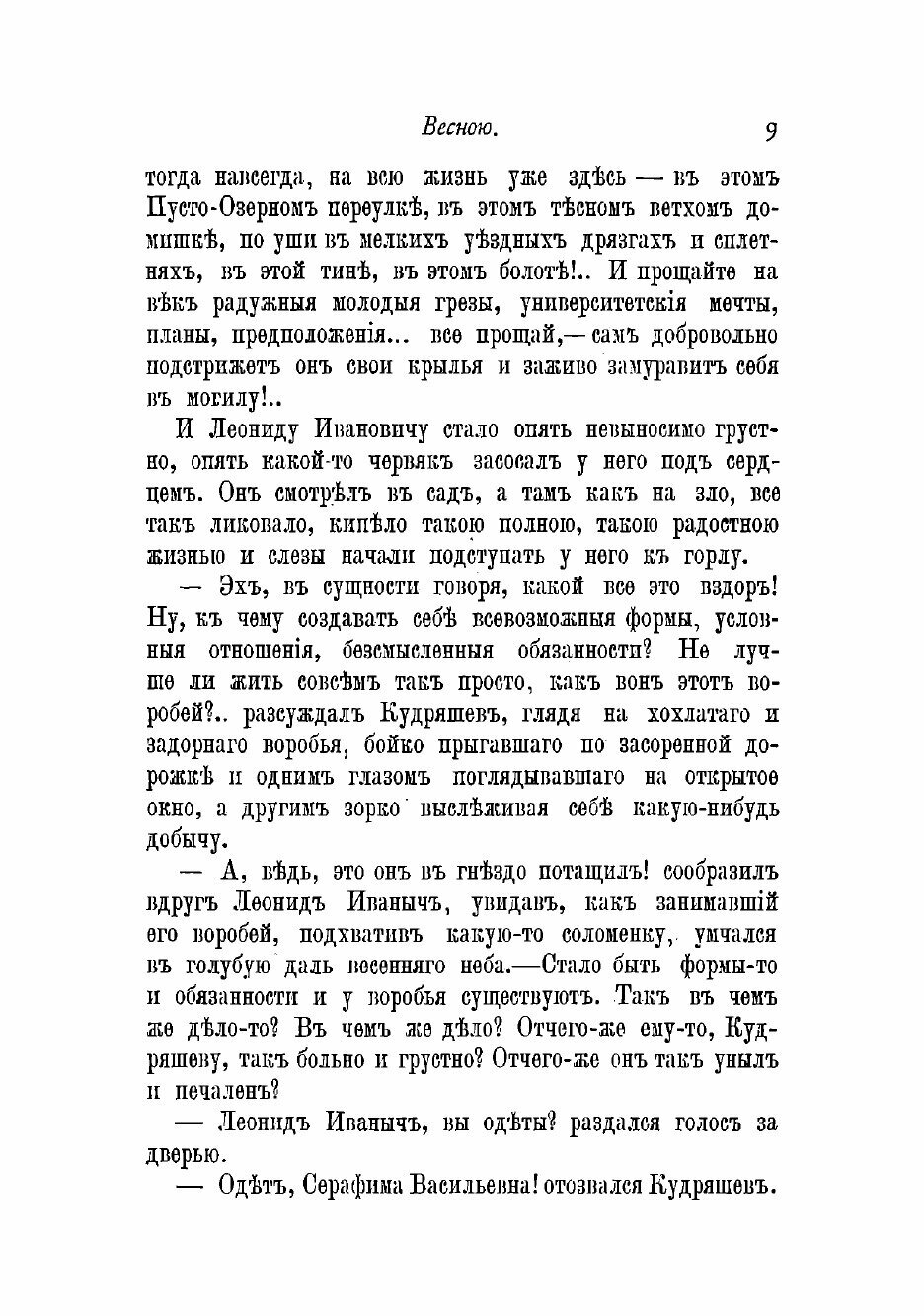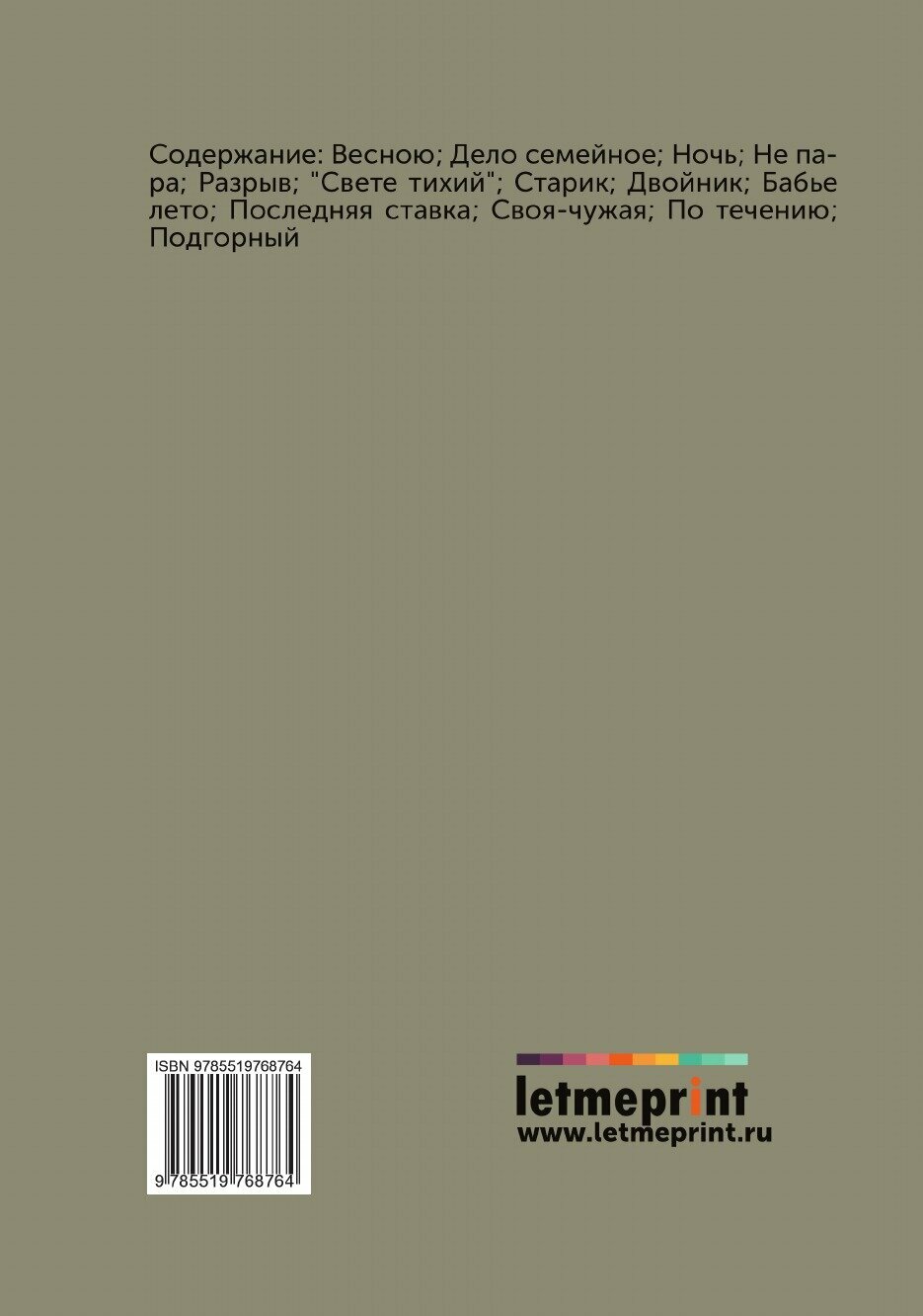 Содержание: Весною; Дело семейное; Ночь; Не пара; Разрыв; "Свете тихий"; Старик; Двойник; Бабье лето; Последняя ставка; Своя-чужая; По течению; Подгорный