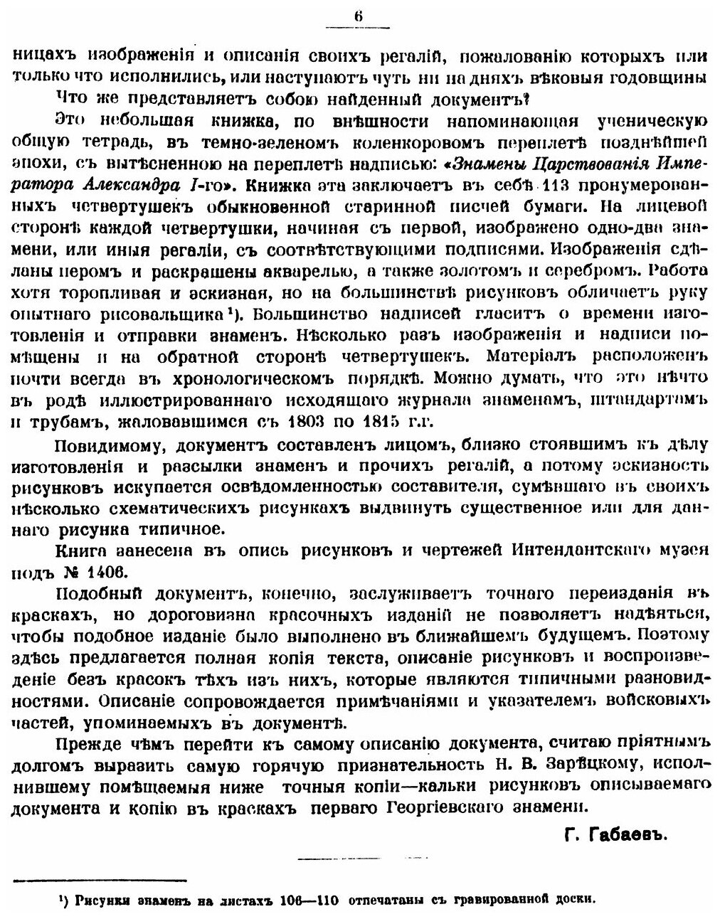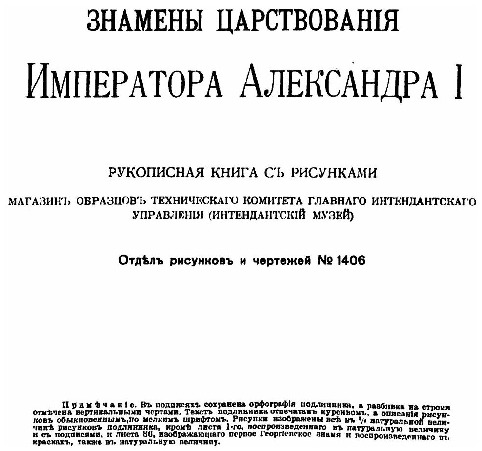 В книге воспроизведена рукописная тетрадь неизвестного автора: "Знамена царствования Императора Александра I-го", представляющая собой нечто вроде иллюстрированного исходящего журнала знаменам, штандартам и трубам, жаловавшимся с 1803 по 1815 год. В книге содержатся рисунки (черно-белые изображения) и описания знамен, штандартов и регалий различных войсковых частей (полки Лейб-гвардии, гренадерские, мушкетерские, пехотные, егерские, кирасирские и другие полки, морские части, учебные и гарнизонные батальоны, казачьи войска, и др. ) с 1803 по 1815 год