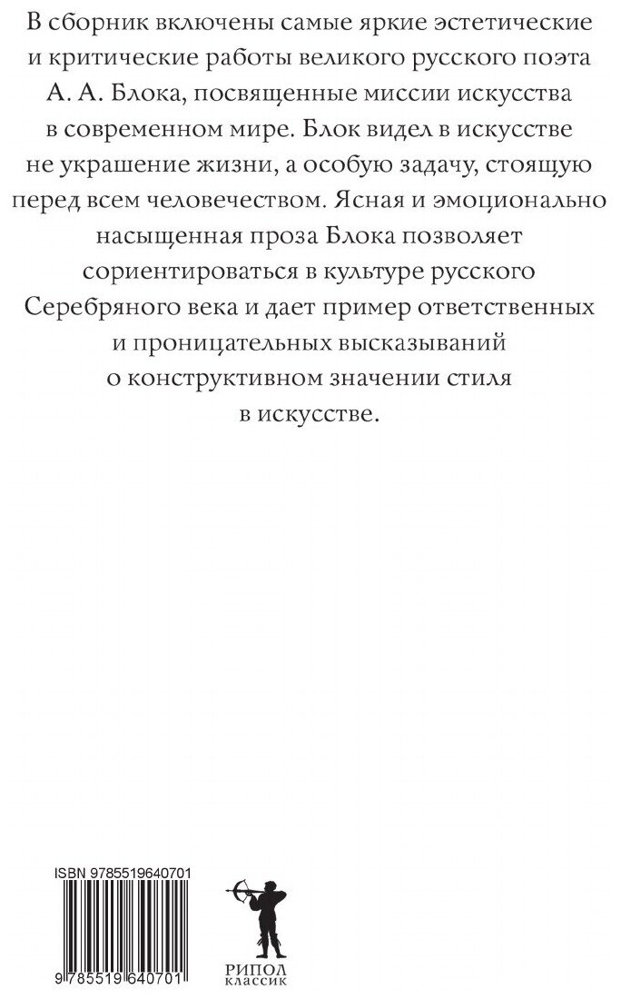 В сборник включены самые яркие эстетические и критические работы великого русского поэта А. А. Блока, посвященные миссии искусства в современном мире. Блок видел в искусстве не украшение жизни, а особую задачу, стоящую перед всем человечеством. Ясная и эмоционально насыщенная проза Блока позволяет сориентироваться в культуре русского Серебряного века и дает пример ответственных и проницательных высказываний о конструктивном значении стиля в искусстве.