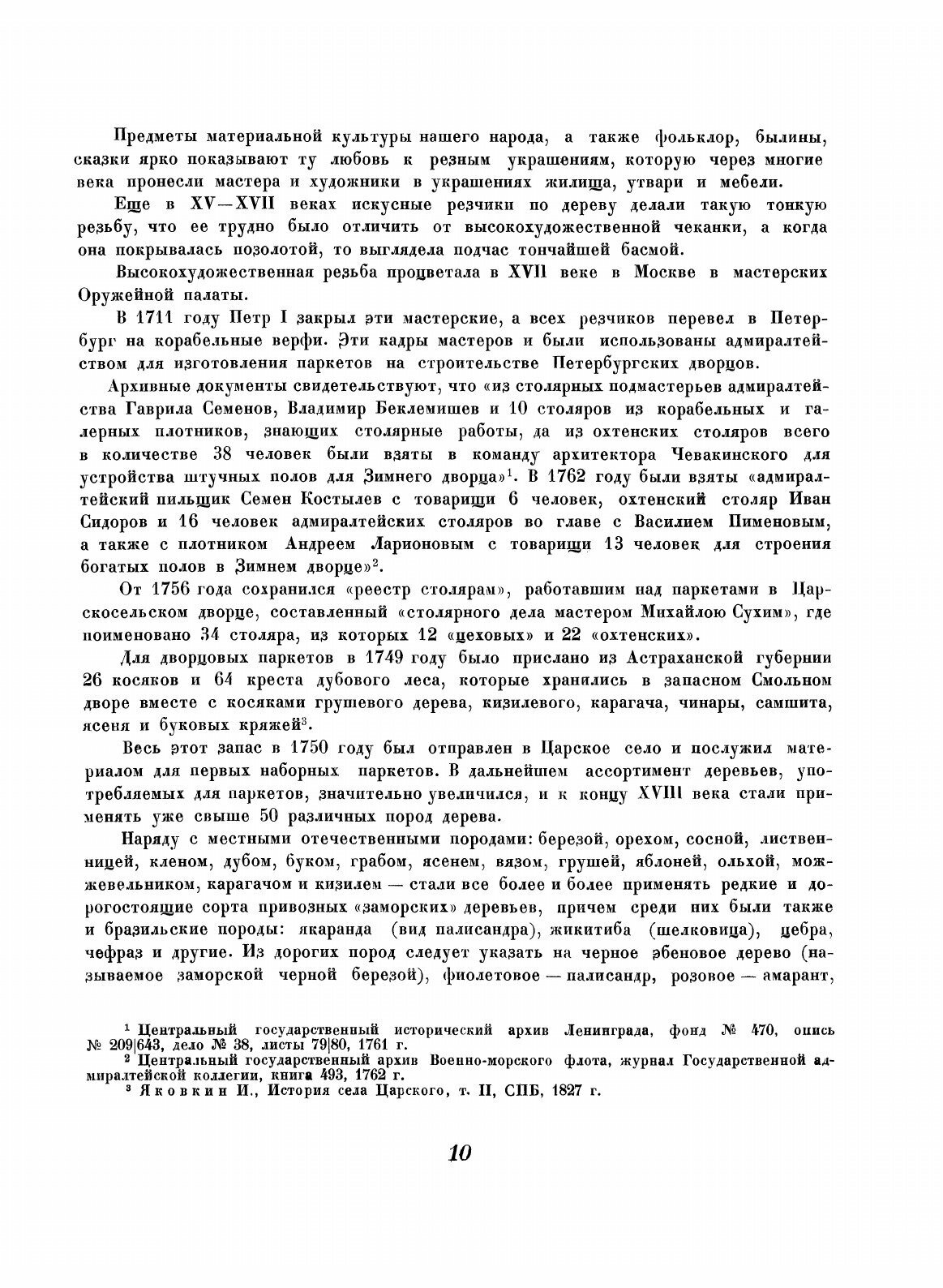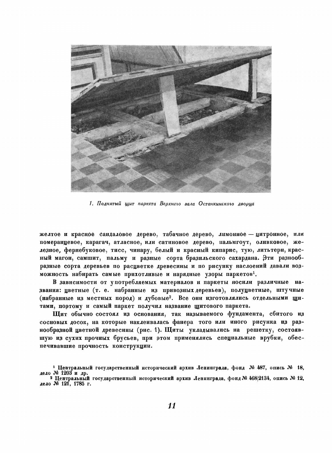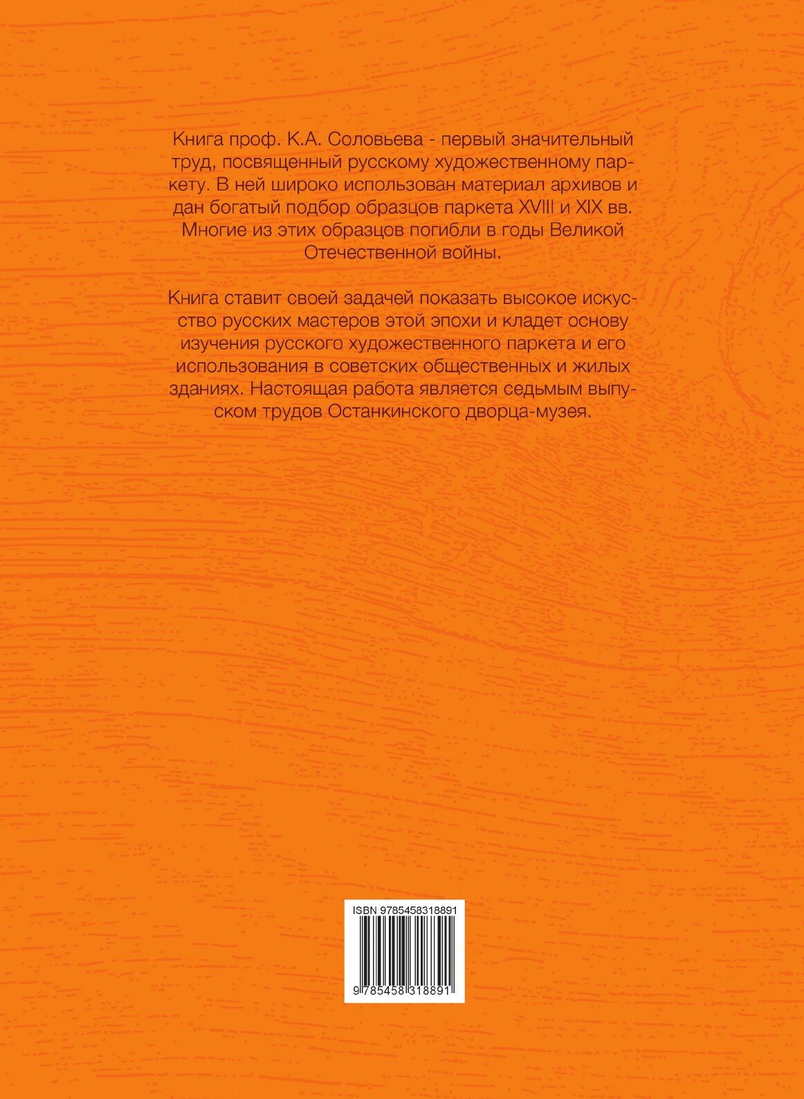 Книга проф. К.А. Соловьева - первый значительный труд, посвященный русскому художественному паркету. В ней широко использован материал архивов и дан богатый подбор образцов паркета XVIII и XIX вв. Многие из этих образцов погибли в годы Великой Отечественной войны. Книга ставит своей задачей показать высокое искусство русских мастеров этой эпохи и кладет основу изучения русского художественного паркета и его использования в советских общественных и жилых зданиях. Настоящая работа является седьмым выпуском трудов Останкинского дворца-музея.