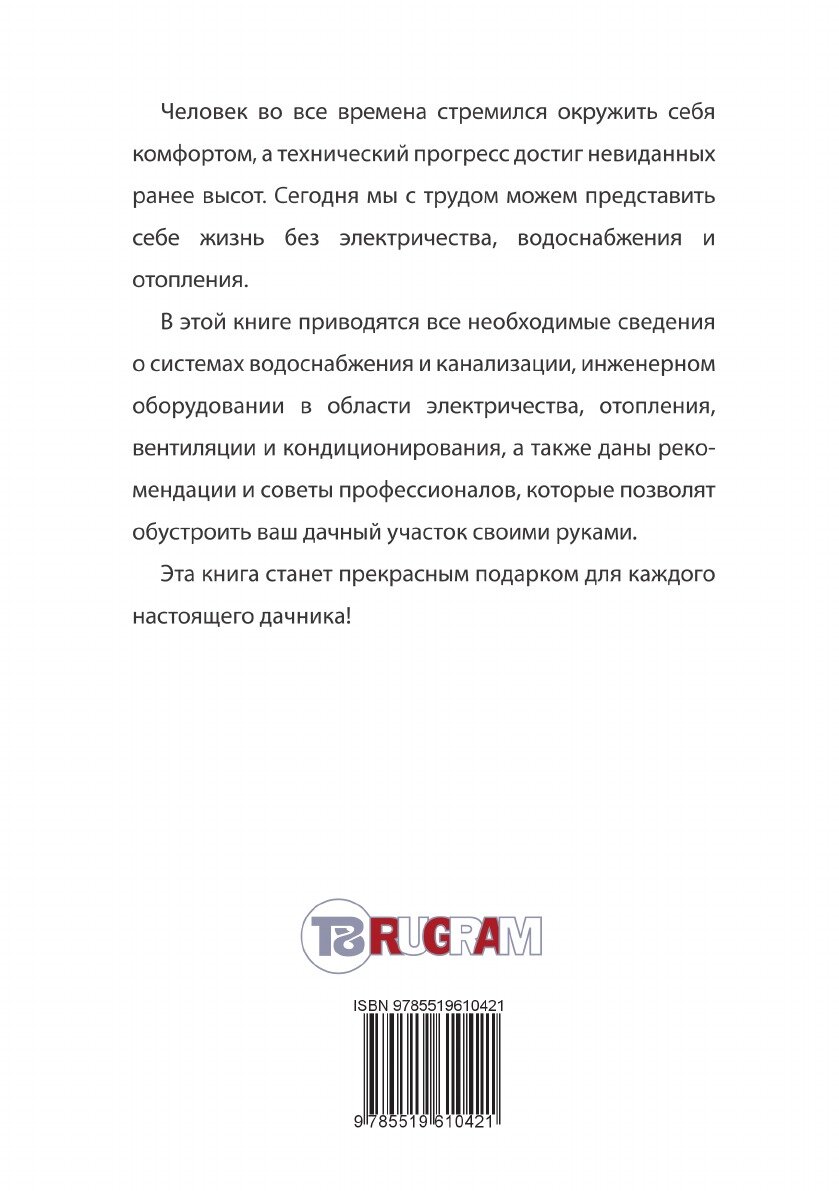 Человек во все времена стремился окружить себя комфортом, а технический прогресс достиг невиданных ранее высот. Сегодня мы с трудом можем представить себе жизнь без электричества, водоснабжения и отопления. В этой книге приводятся все необходимые сведения о системах водоснабжения и канализации, инженерном оборудовании в области электричества, отопления, вентиляции и кондиционирования, а также даны рекомендации и советы профессионалов, которые позволят обустроить ваш дачный участок своими руками.
