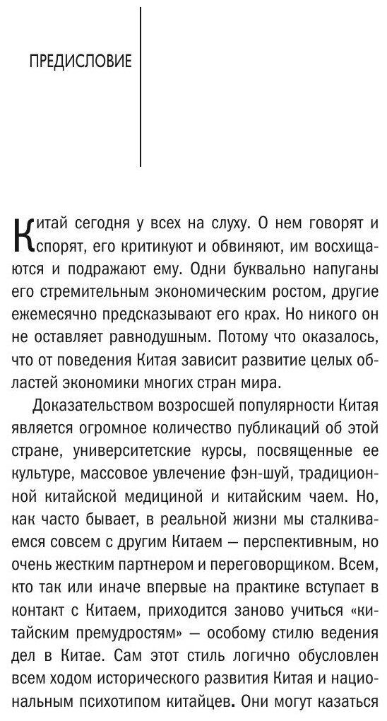 Китай сегодня у всех на слуху. О нем говорят и спорят, его критикуют и обвиняют, им восхищаются и подражают ему. Все, кто вступает в отношения с китайцами, сталкиваются с "китайскими премудростями". Как только вы попадаете в Китай, автоматически включаются веками отработанный механизм, нацеленный на то, чтобы завоевать ваше доверие, сделать вас не просто своим другом, но и сторонником. Вы приезжаете в Китай со своими целями, а уезжаете переориентированным на китайское мнение. Жизнь в Китае наполнена таким количеством мелких нюансов и неожиданностей, что невозможно не только к ним подготовиться, но даже их предугадать. Китайцы накапливали опыт столетиями - столетиями выживания, расширения жизненного пространства и выдавливания "варваров". Пора в Китай, чтобы потом полгода с печалью произносить: "Как жаль,что Китай как Юань-Цзинь от меня". Это ты будешь грустить, что Китай далеко.