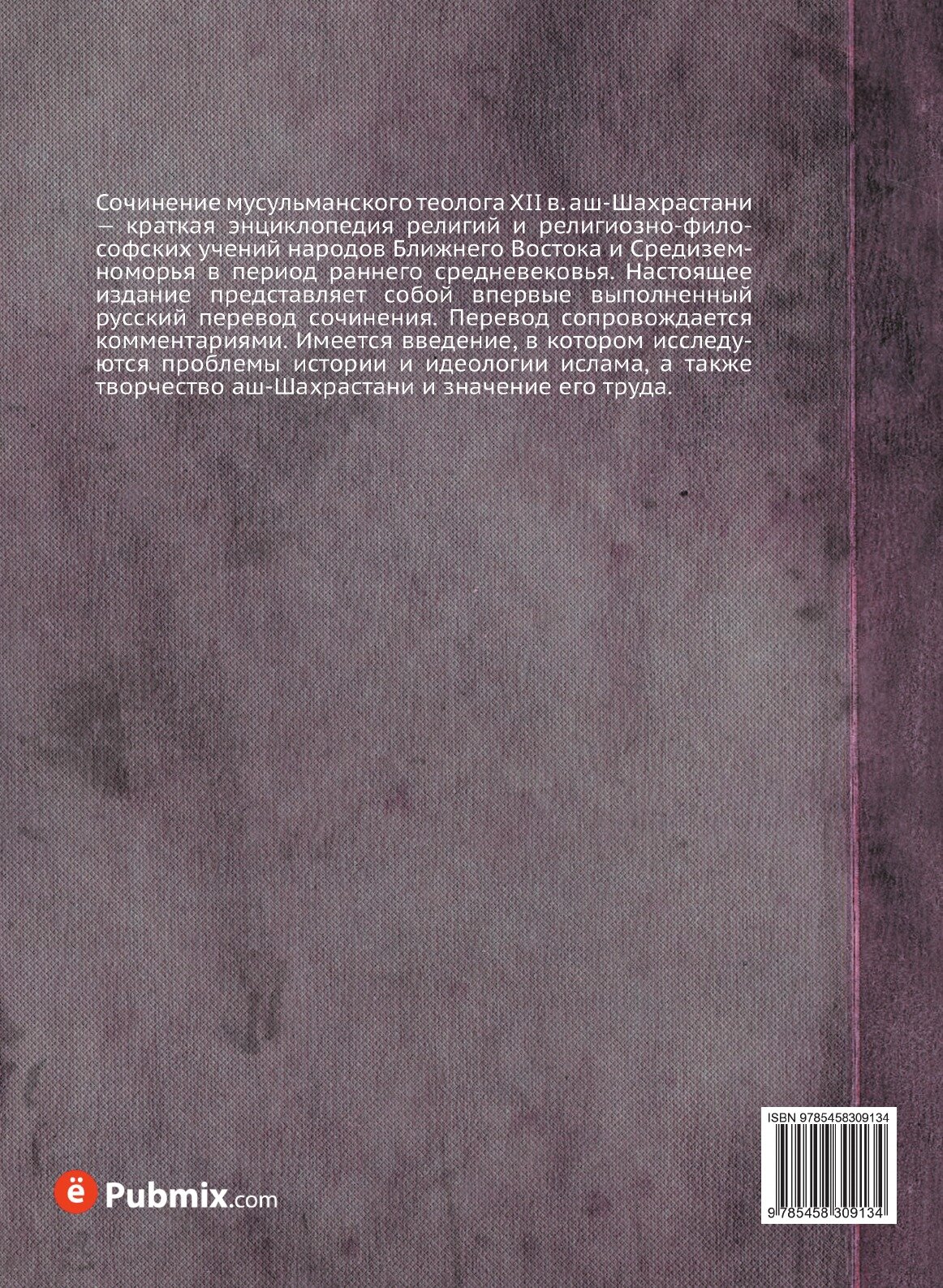 Эта книга - репринт оригинального издания (издательство "Наука", 1984 год), созданный на основе электронной копии высокого разрешения, которую очистили и обработали вручную, сохранив структуру и орфографию оригинального издания. Редкие, забытые и малоизвестные книги, изданные с петровских времен до наших дней, вновь доступны в виде печатных книг.. Сочинение мусульманского теолога XII в. аш-Шахрастани - краткая энциклопедия религий и религиозно-философских учений народов Ближнего Востока и Средиземноморья в период раннего средневековья. Настоящее издание представляет собой впервые выполненный русский перевод сочинения. Перевод сопровождается комментариями. Имеется введение, в котором исследуются проблемы истории и идеологии ислама, а также творчество аш-Шахрастани и значение его труда.