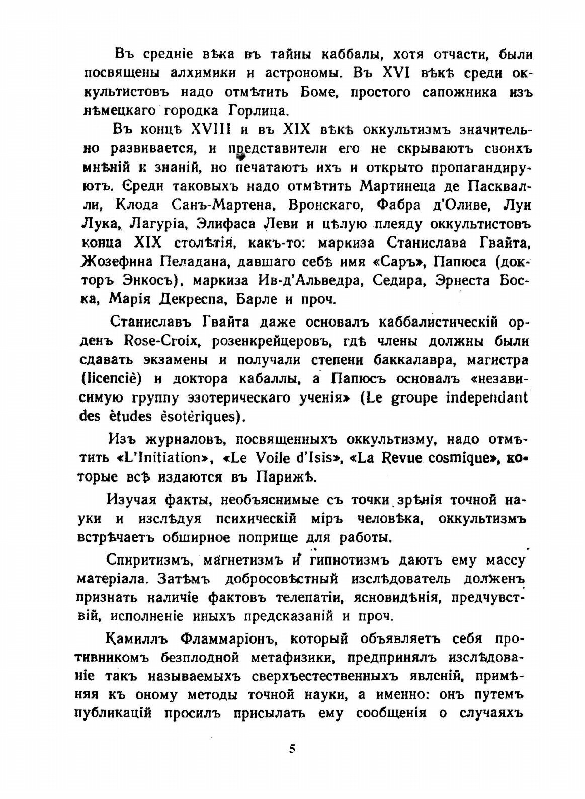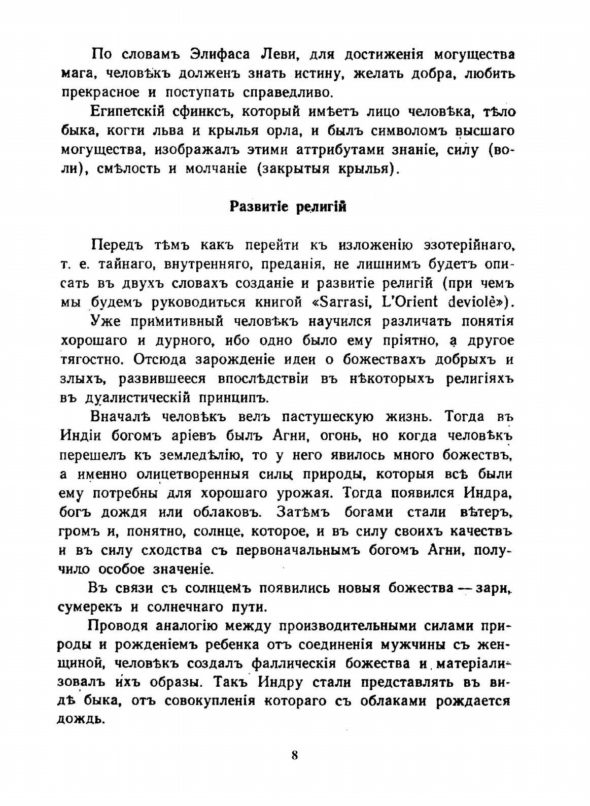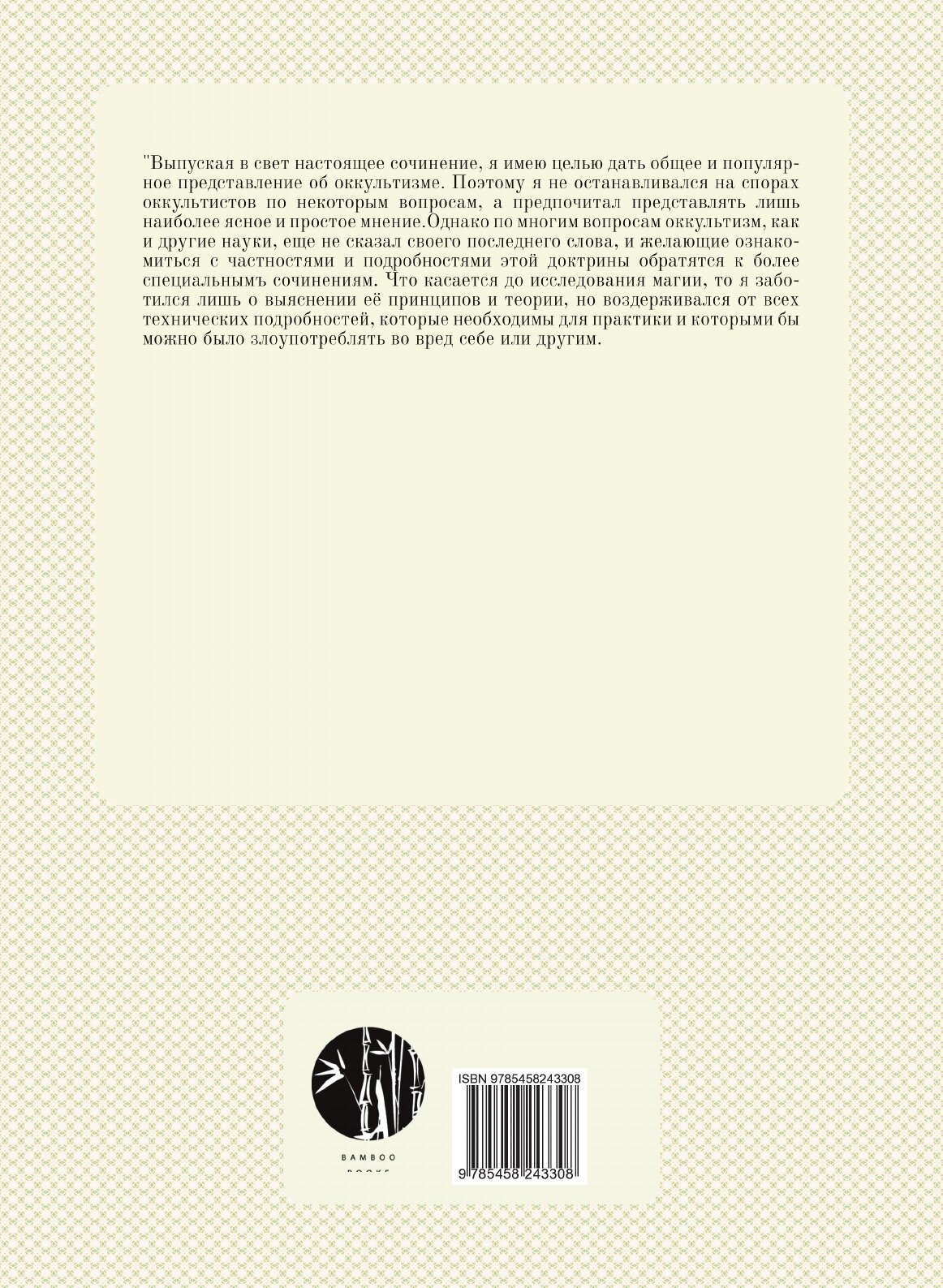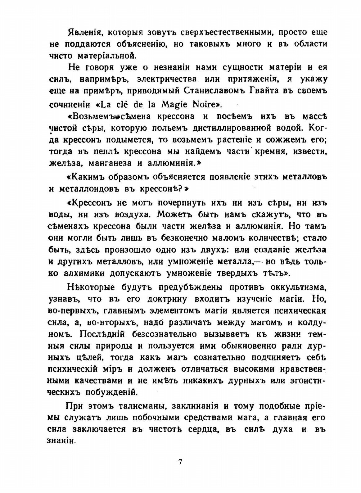 "Выпуская в свет настоящее сочинение, я имею целью дать общее и популярное представление об оккультизме. Поэтому я не останавливался на спорах оккультистов по некоторым вопросам, а предпочитал представлять лишь наиболее ясное и простое мнение. Однако по многим вопросам оккультизм, как и другие науки, еще не сказал своего последнего слова, и желающие ознакомиться с частностями и подробностями этой доктрины обратятся к более специальнымъ сочинениям. Что касается до исследования магии, то я заботился лишь о выяснении её принципов и теории, но воздерживался от всех технических подробностей, которые необходимы для практики и которыми бы можно было злоупотреблять во вред себе или другим. Воспроизведено в оригинальной авторской орфографии издания 1907 года (издательство "А.С.Суворина").