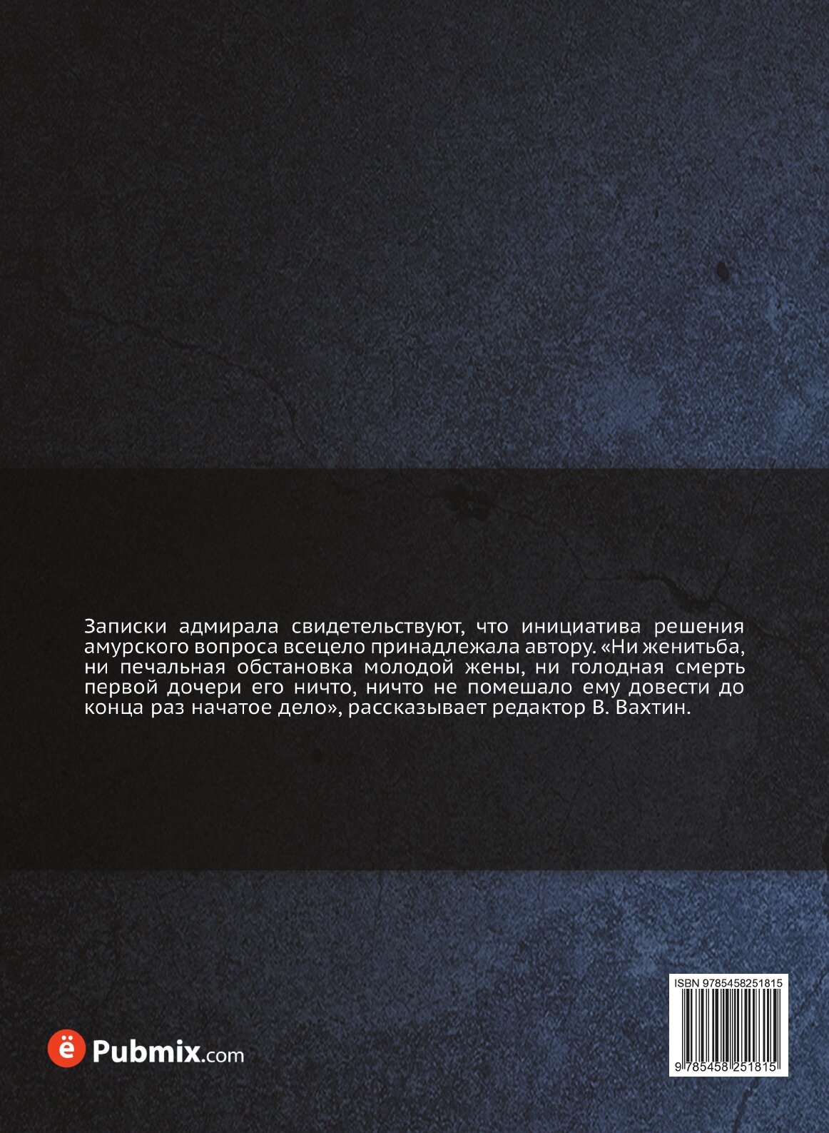 Эта книга — репринт оригинального издания (издательство "Русская скоропечатня", 1878 год), созданный на основе электронной копии высокого разрешения, которую очистили и обработали вручную, сохранив структуру и орфографию оригинального издания. Редкие, забытые и малоизвестные книги, изданные с петровских времен до наших дней, вновь доступны в виде печатных книг._x000D_ _x000D_ Записки адмирала свидетельствуют, что инициатива решения амурского вопроса всецело принадлежала автору. «Ни женитьба, ни печальная обстановка молодой жены, ни голодная смерть первой дочери его ничто, ничто не помешало ему довести до конца раз начатое дело», рассказывает редактор В. Вахтин.