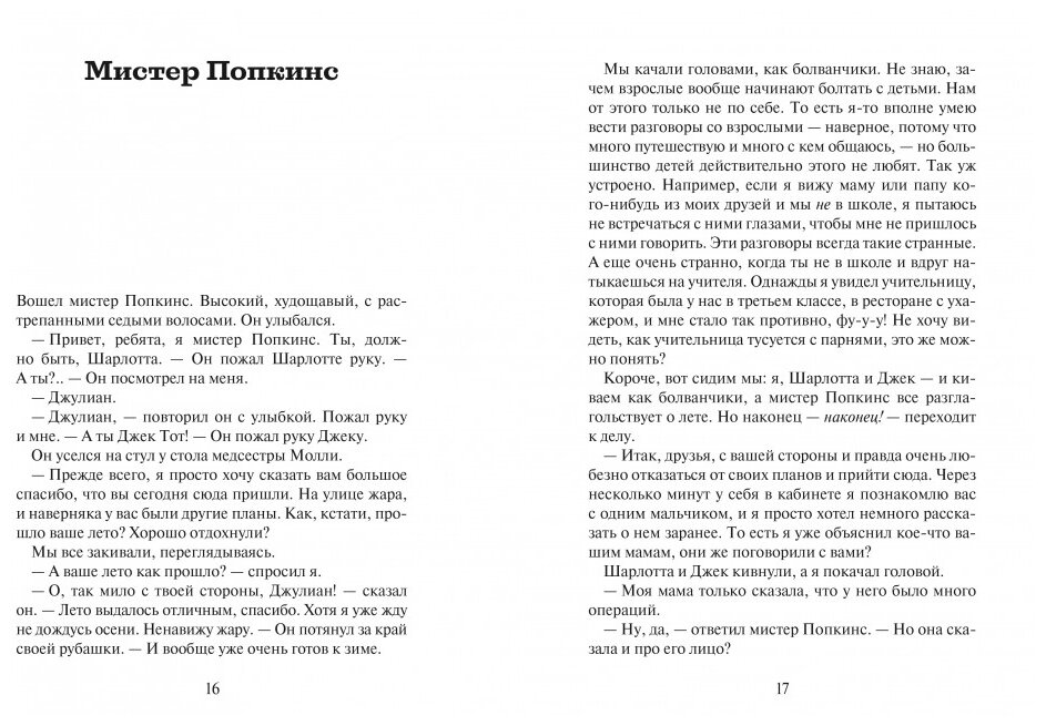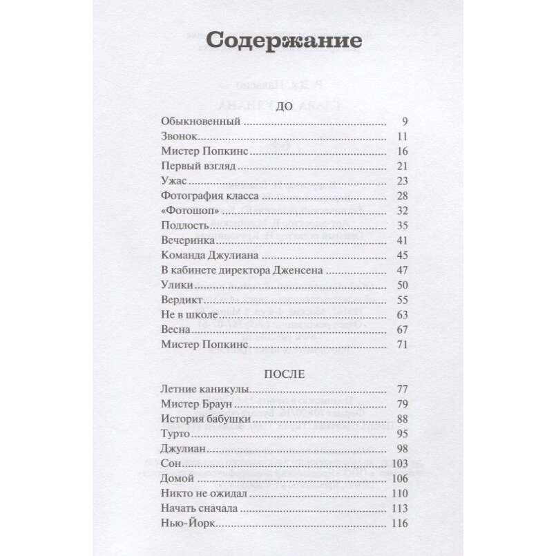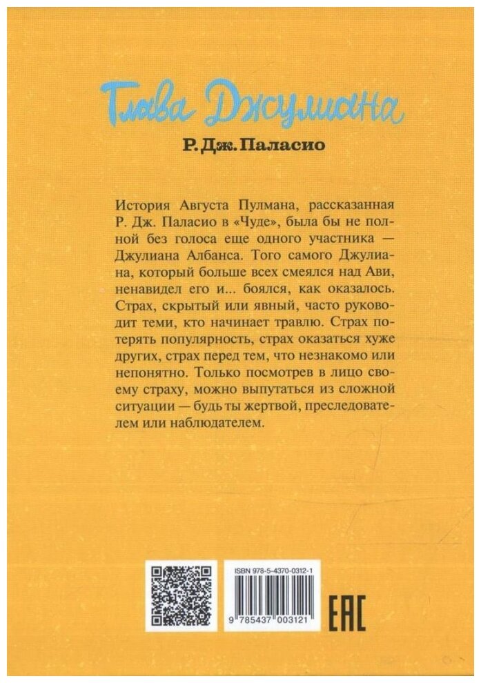 История Августа Пулмана, рассказанная Р. Дж. Паласио в "Чуде", была бы не полной без голоса еще одного участника - Джулиана Албанса. Того самого Джулиана, который больше всех смеялся над Ави, ненавидел его и. боялся, как оказалось. Страх, скрытый или явный, часто руководит теми, кто начинает травлю. Страх потерять популярность, страх оказаться хуже других, страх перед тем, что незнакомо или непонятно. Только посмотрев в лицо своему страху, можно выпутаться из сложной ситуации - будь ты жертвой, преследователем или наблюдателем.
