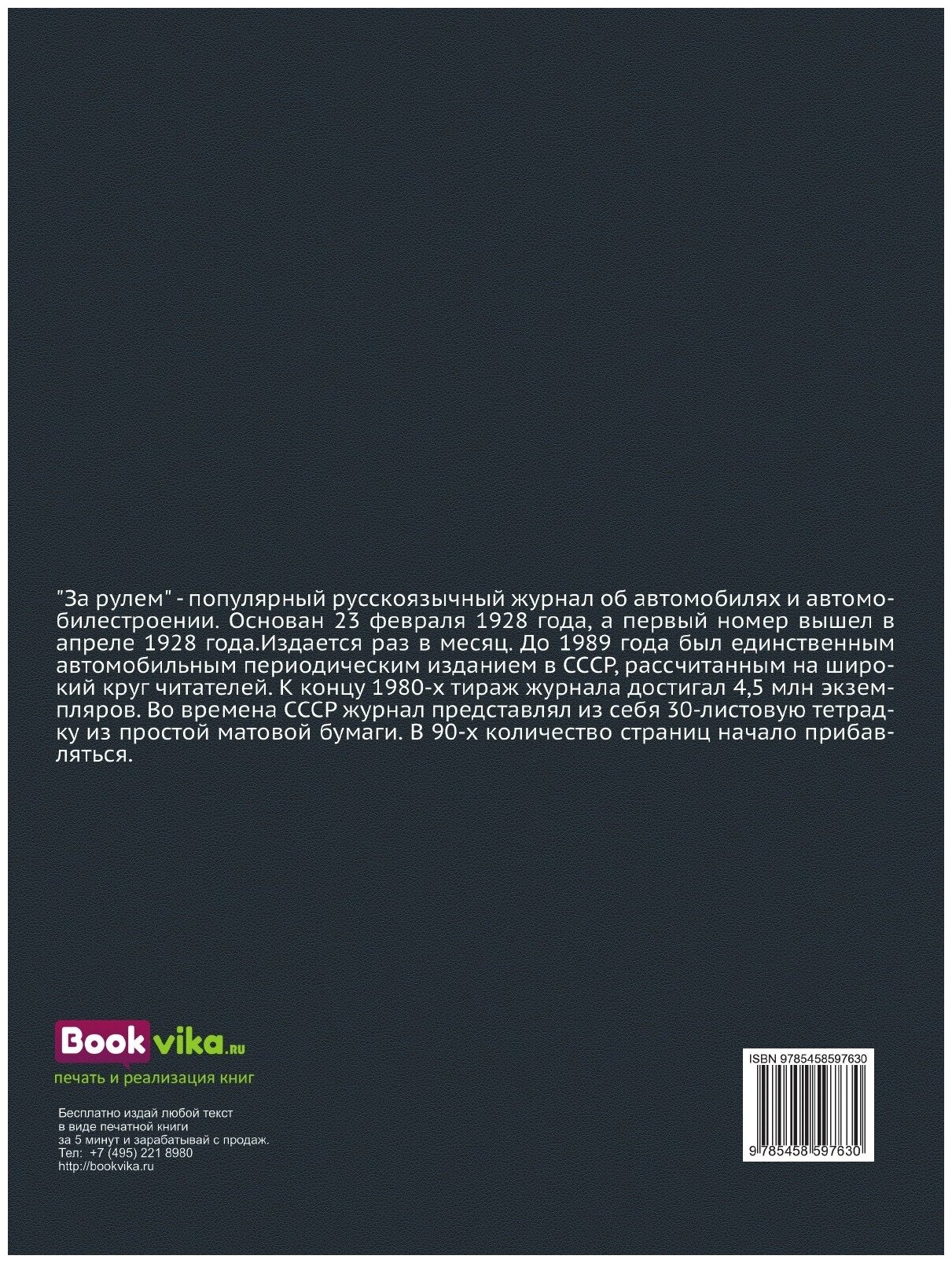 "За рулем" - популярный русскоязычный журнал об автомобилях и автомобилестроении. Основан 23 февраля 1928 года, а первый номер вышел в апреле 1928 года.Издается раз в месяц. До 1989 года был единственным автомобильным периодическим изданием в СССР, рассчитанным на широкий круг читателей. К концу 1980-х тираж журнала достигал 4,5 млн экземпляров. Во времена СССР журнал представлял из себя 30-листовую тетрадку из простой матовой бумаги. В 90-х количество страниц начало прибавляться.