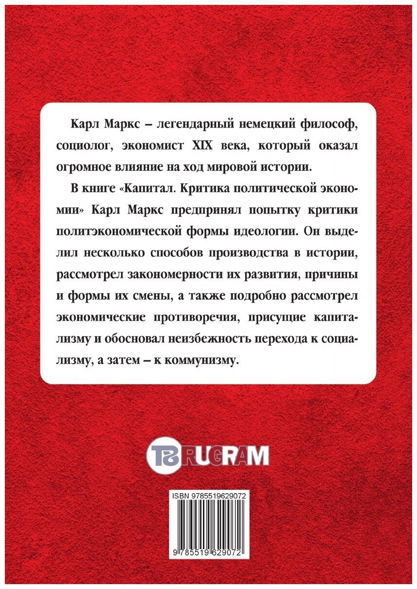 В книге "Капитал. Критика политической экономии" Карл Маркс предпринял попытку критики политэкономической формы идеологии. Он выделил несколько способов производства в истории, рассмотрел закономерности их развития, причины и формы их смены, а также подробно рассмотрел экономические противоречия, присущие капитализму и обосновал неизбежность перехода к социализму, а затем - к коммунизму.Издательство T8RUGRAMМягкий переплетОбъем - 638 стр.Формат - 148x210 мм.ISBN 978-5-519-62907-2Год издания: 2018