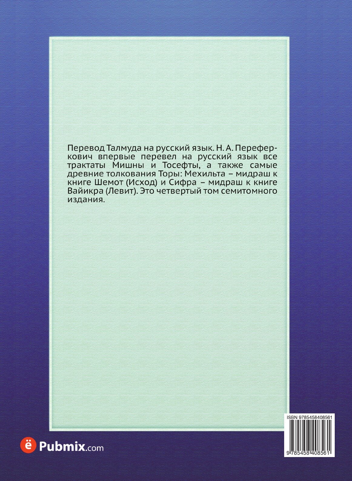 Перевод Талмуда на русский язык. Н. А. Переферкович впервые перевел на русский язык все трактаты Мишны и Тосефты, а также самые древние толкования Торы: Мехильта - мидраш к книге Шемот (Исход) и Сифра - мидраш к книге Вайикра (Левит). Это четвертый том семитомного издания. Воспроизведено в оригинальной авторской орфографии издания 1902 года (издательство "Типография П.П. Сойкина").