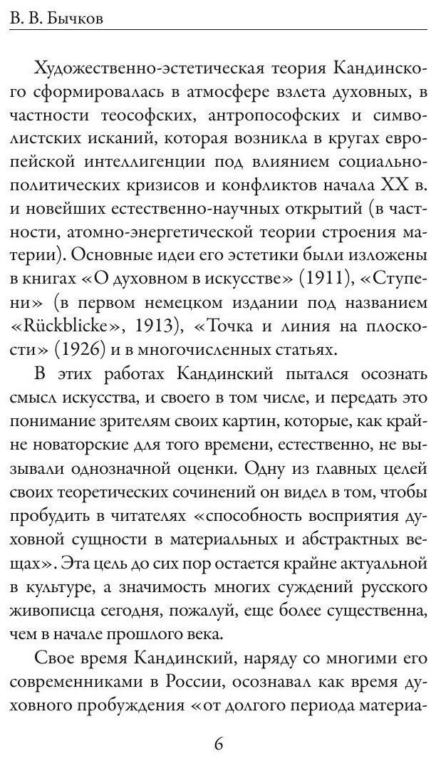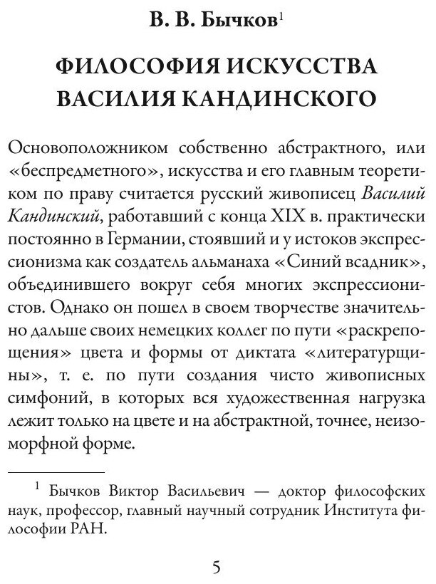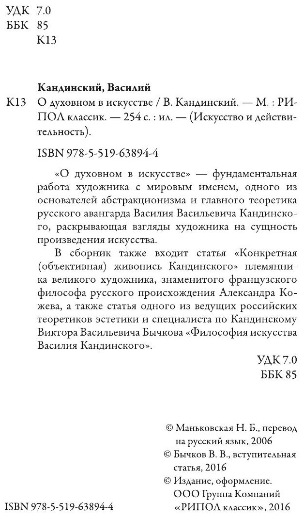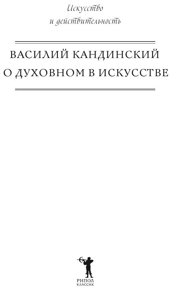 "О духовном в искусстве" - фундаментальная работа художника с мировым именем, одного из основателей абстракционизма и главного теоретика русского авангарда Василия Васильевича Кандинского, раскрывающая взгляды художника на сущность произведения искусства. В сборник также входит статья "Конкретная (объективная) живопись Кандинского" племянника великого художника, знаменитого французского философа русского происхождения Александра Кожева, а также статья одного из ведущих российских теоретиков эстетики и специалиста по Кандинскому Виктора Васильевича Бычкова "Философия искусства Василия Кандинского".