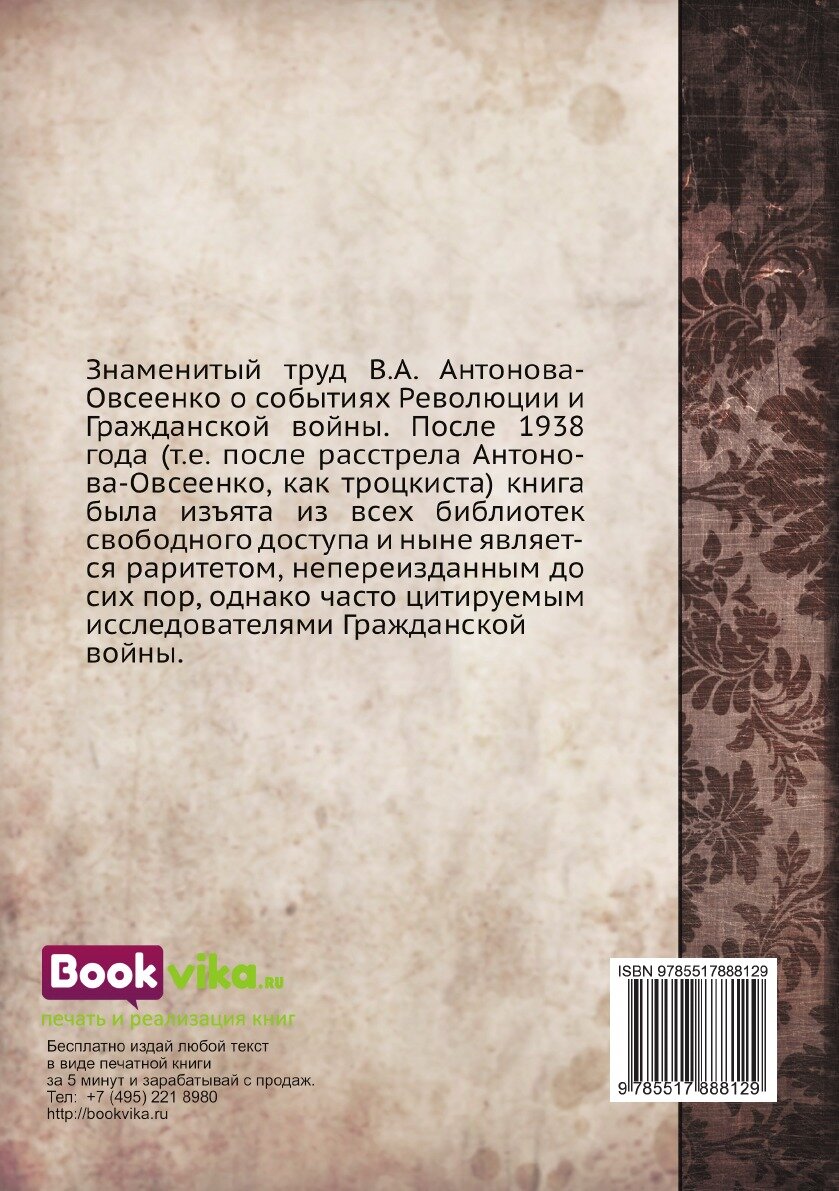 Знаменитый труд В.А.Антонова-Овсеенко о событиях Революции и Гражданской войны. После 1938 года (т.е. после расстрела Антонова-Овсеенко, как троцкиста) книга была изъята из всех библиотек свободного доступа и ныне является раритетом, непереизданным до сих пор, однако часто цитируемым исследователями Гражданской войны. Репринтное издание по технологии print-on-demand с оригинала 1924 года.