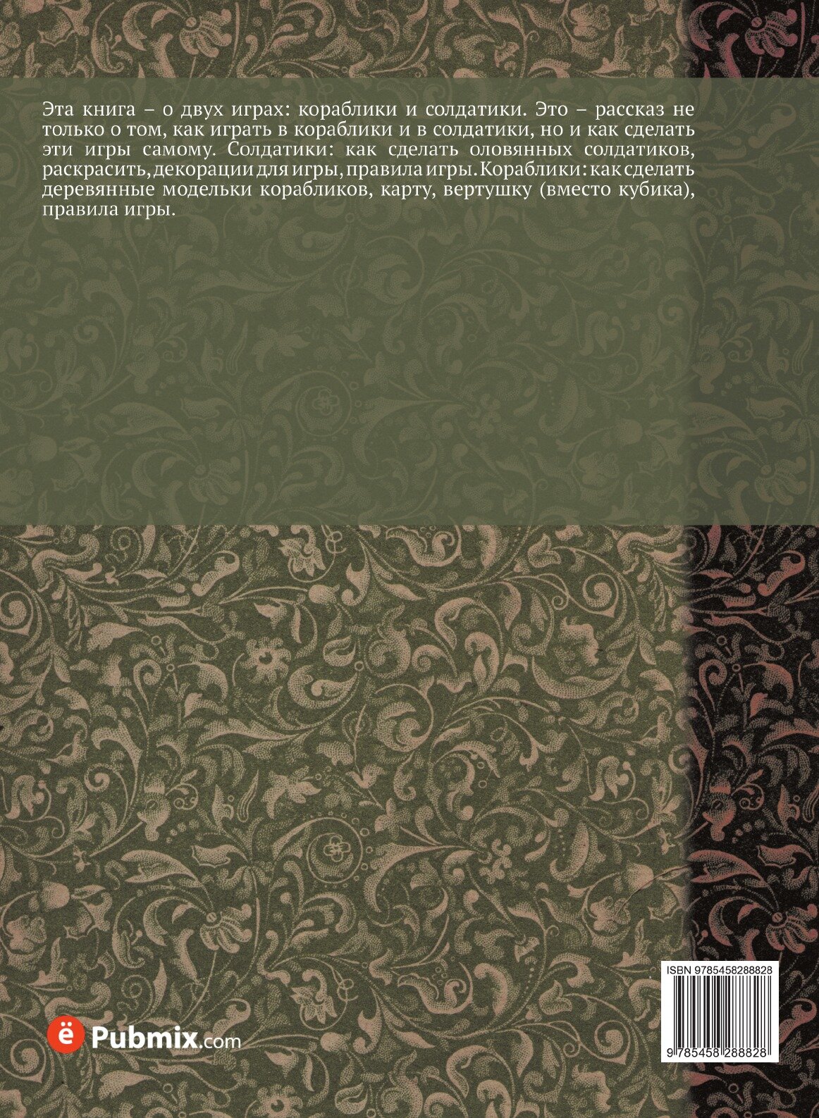 Эта книга – о двух играх: кораблики и солдатики. Это – рассказ не только о том, как играть в кораблики и в солдатики, но и как сделать эти игры самому. Солдатики: как сделать оловянных солдатиков, раскрасить, декорации для игры, правила игры. Кораблики: как сделать деревянные модельки корабликов, карту, вертушку (вместо кубика), правила игры.