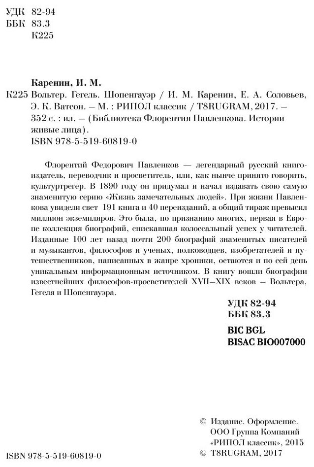 Флорентий Федорович Павленков — легендарный русский книгоиздатель, переводчик и просветитель, или, как нынче принято говорить, культуртрегер. В 1890 году он придумал и начал издавать свою самую знаменитую серию «Жизнь замечательных людей». При жизни Павленкова увидели свет 191 книга и 40 переизданий, а общий тираж превысил миллион экземпляров. Это была, по признанию многих, первая в Европе коллекция биографий, снискавшая колоссальный успех у читателей. Изданные 100 лет назад почти 200 биографий знаменитых писателей и музыкантов, философов и ученых, полководцев, изобретателей и путешественников, написанных в жанре хроники, остаются и по сей день уникальным информационным источником. В книгу вошли биографии известнейших философов-просветителей XVII–XIX веков – Вольтера, Гегеля и Шопенгауэра.