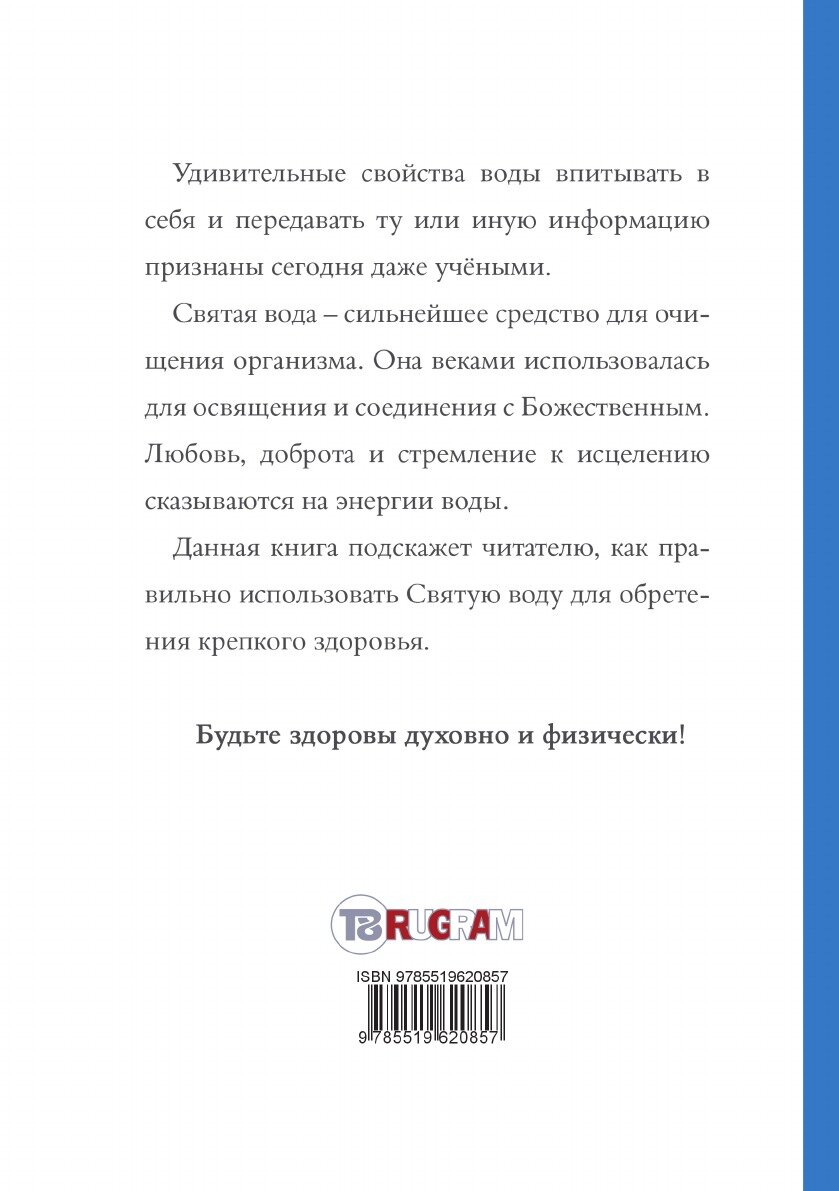 Удивительные свойства воды впитывать в себя и передавать ту или иную информацию признаны сегодня даже учёными. Святая вода - сильнейшее средство для очищения организма. Она веками использовалась для освящения и соединения с Божественным. Любовь, доброта и стремление к исцелению сказываются на энергии воды. Данная книга подскажет читателю, как правильно использовать Святую воду для обретения крепкого здоровья. Будьте здоровы духовно и физически!Издательство T8RUGRAMМягкий переплетОбъем - 256 стр.Формат - 148x210 мм.ISBN 978-5-519-62085-7Год издания: 2018